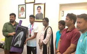 झारखंड के खेल मंत्री हफीजुल हसन ने स्वर्ण पदक विजेता आर्चर गोल्डी मिश्रा को रिकर्व राउंड का दिया तीर-धनुष