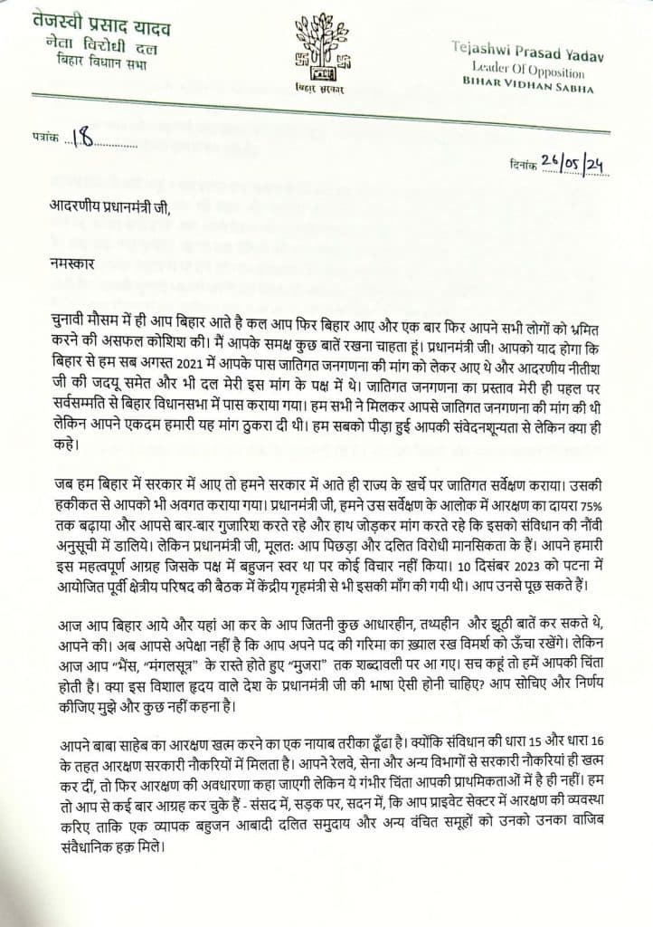 तेजस्वी ने पत्र में आरक्षण को लेकर लिखा है कि प्रधानमंत्री जी, हमने उस सर्वेक्षण के आलोक में आरक्षण का दायरा 75% तक बढ़ाया और आपसे बार-बार गुजारिश करते रहे और हाथ जोड़कर मांग करते रहे कि इसको संविधान की नौंवी अनुसूची में डालिये, लेकिन प्रधानमंत्री जी, मूलतः आप पिछड़ा और दलित विरोधी मानसिकता के हैं. आपने हमारी इस महत्वपूर्ण आग्रह जिसके पक्ष में बहुजन स्वर था पर आपने कोई विचार नहीं किया. 10 दिसंबर 2023 को पटना में आयोजित पूर्वी क्षेत्रीय परिषद की बैठक में केंद्रीय गृहमंत्री से भी इसकी माँग की गयी थी. आप उनसे पूछ सकते हैं. आज आप बिहार आये और यहां आ कर के आप जितनी कुछ आधारहीन, तथ्यहीन और झूठी बातें कर सकते थे, आपने की. अब आपसे अपेक्षा नहीं है कि आप अपने पद की गरिमा का ख़्याल रख विमर्श को ऊँचा रखेंगे, लेकिन आज आप “भैंस, “मंगलसूत्र” के रास्ते होते हुए “मुजरा” तक की शब्दावली पर आ गए. सच कहूं तो हमें आपकी चिंता होती है. क्या इस विशाल हृदय वाले देश के प्रधानमंत्री जी कि भाषा ऐसी होनी चाहिए? आप सोचिए और निर्णय कीजिए मुझे और कुछ नहीं कहना है.