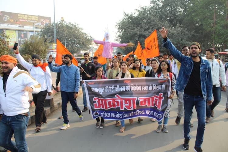 पटना. एबीवीपी पटना महानगर इकाई ने भागलपुर में नीलम देवी की हुई निर्मम हत्या के विरुद्ध बीएन कॉलेज से कारगिल चौक तक आक्रोश मार्च निकाला. बीएन कालेज से निकले मार्च में सैकड़ों छात्र शामिल हुए. कारगिल चौक पहुंच कर छात्रों ने मुख्यमंत्री नीतीश कुमार का पुतला दहन किया.