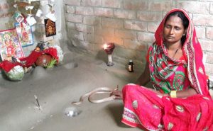 नवरात्र में पहले ही दिन से सांप की पूजा कर रही एक महिला