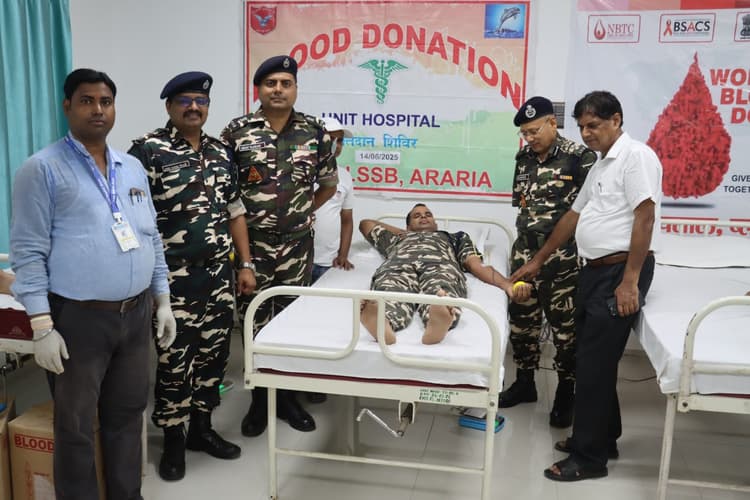 अररिया. एसएसबी 52वीं वाहिनी के कमांडेंट महेंद्र प्रताप के निर्देशन में सदर अस्पताल के साथ संयुक्त रूप से विश्व रक्तदाता दिवस पर वाहिनी मुख्यालय में रक्तदान शिविर का आयोजन किया गया. इसकी जानकारी देते हुए कमांडेंट महेंद्र प्रताप ने बताया कि शिविर का मुख्य उद्देश्य आम लोगों को रक्तदान के प्रति जागरूक करना व समय-समय पर रक्तदान करके कई लोगों की जान बचाने वालों को धन्यवाद देना है. हमारे जवानों द्वारा समय-समय पर रक्तदान किया जाता है. इसके अलावा भी सशस्त्र सीमा बल के द्वारा जन सेवा के लिए अनेकों ऐसे कदम उठाये जाते हैं. जिनसे सीमावर्ती इलाके में रह रहे लोगों की मदद व विकास हो सके. सीमा रक्षण के साथ-साथ नागरिक कल्याण कार्यक्रम के अंतर्गत कौशल विकास प्रशिक्षण, मानव चिकित्सा शिविर, पशु चिकित्सा शिविर व अन्य कई प्रकार के कार्यक्रम भी आयोजित किये जाते हैं. जिसका सीधा लाभ सीमावर्ती ग्रामीणों को मिलता है. शिविर में सहायक कमांडेंट सहित कुल 38 जवानों ने स्वैच्छिक रक्तदान किया. सभी रक्तदाताओं को सदर अस्पताल की ओर से प्रशंसा पत्र दिया गया. इस दौरान 52 वीं वाहिनी के उप कमांडेंट उदय कुमार उप कमांडेंट, उप कमांडेंट जोशी सागर प्रदीप, सहायक कमांडेंट प्रमोद कुमार, अमित कुमार अहिरवार, सहायक उप निरीक्षक (चिकित्सा) संगलाई महाई, आ सचिन, राजकुमार मंडल व सदर अस्पताल के चिकित्सा अधिकारी डॉ जितेंद्र कुमार, जेएनएम नाजिया प्रवीन, ब्लड बैंक प्रभारी बादल कुमार शाह सहित अन्य कार्मिक मौजूद थे.15