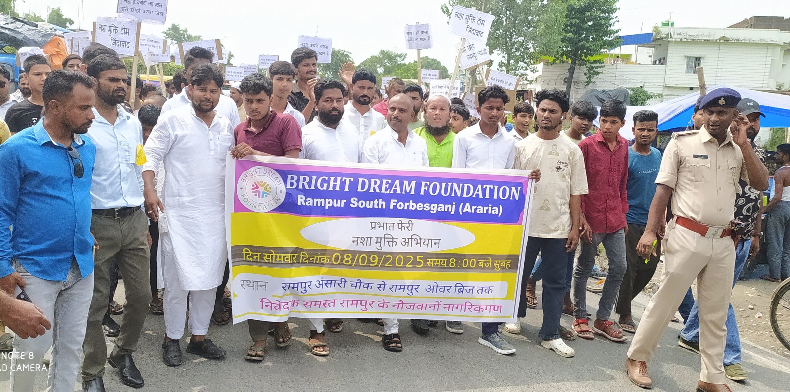 फारबिसगंज. प्रखंड के रामपुर पंचायत में सोमवार को नशामुक्ति जागरूकता रैली निकाली गयी. संस्था ब्राइट ड्रीम फाउंडेशन रामपुर के बैनर तले रामपुर अंसारी चौक से रामपुर ओवरब्रिज तक नशामुक्त हो समाज हमारा नारा के साथ नशा मुक्ति जागरूकता रैली सह प्रभातफेरी निकाली गयी. जागरूकता रैली में स्थानीय ग्रामीणों के अलावा शिक्षण संस्थानों,कोचिंग संस्थानों,मदरसा के शिक्षकों व बच्चों ने भाग लिया. जागरूकता रैली में शामिल ग्रामीणों,शिक्षकों व बच्चों ने अपने हाथों में स्लोगन लिखे तख्ती ले कर लोगो से अपील की कि नशा से दूर रहें व इस सामाजिक बुराई के खिलाफ चल रहे अभियान का हिस्सा बनें. नशा एक धीमा जहर है, जो न सिर्फ व्यक्ति बल्कि पूरे परिवार और समाज को खोखला कर देता है. समय आ गया है कि हम सब मिलकर इस बुराई के खिलाफ आवाज उठाएं और रामपुर सहित आसपास के क्षेत्र को नशा मुक्त बनाये. नशामुक्ति जागरूकता रैली राजद नेता मनोज विश्वास, युवा समाजसेवी इंंतेशार आलम, अबुतल्हा, अदनान सामी, सफाज अंसारी, शादाब रामपुरी, नौशाद अहमद, इम्तियाज अंसारी, शाहनवाज अंसारी, मौलाना दिलशाद साहब, हाफिज जमशेद, मो इंतखाब, मो इम्तियाज शैख, इंतेसार आलम, महताब रहमानी, हाफिज मिर्जा सहित अन्य लोग शामिल थे.