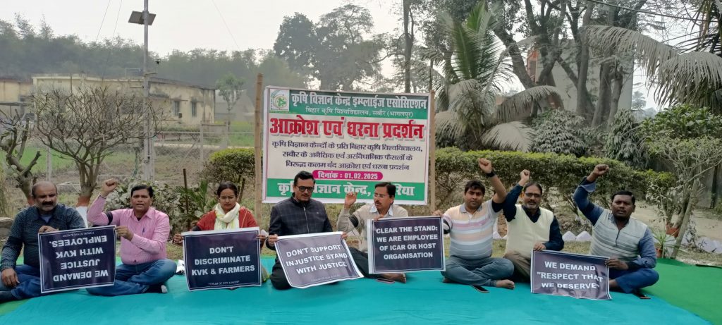 -22- प्रतिनिधि, अररिया बिहार कृषि विश्वविद्यालय सबौर द्वारा गत 29 जनवरी को जारी पदोन्नति रद्द करने संबंधी पत्र व 31 जनवरी को जारी सेवानिवृत्ति संबंधी पत्र के विरोध में कृषि विज्ञान केंद्र के सभी कर्मियों ने एक दिवसीय कलम बंद सांकेतिक हड़ताल का आयोजन किया. हड़ताल पर बैठे केवीके के कर्मियों के कहा कि अवैधानिक रूप से तुगलकी फरमान के तरह कृषि विज्ञान केंद्र के कर्मियों के साथ विश्वविद्यालय द्वारा व्यवहार किया जा रहा है. एक तरफ राज्य सरकार विश्वविद्यालय व भारत सरकार अतिरिक्त कार्यों के बोझ को कराकर कृषि विज्ञान केंद्र के कर्मियों का शोषण कर रही है तो दूसरी तरफ सहमति पत्र की गलत व्याख्या के आलोक में पदोन्नति को रद्द व सेवानिवृत्ति का आदेश जारी कर रही है. जो संवैधानिक दायित्वों का घोर उल्लंघन है. विश्वविद्यालय अधिनियम के तहत नियुक्त करने व स्थायी रूप से दशकों पूर्व से सभी शर्तों में छेड़छाड़ बिना तथ्यों को समझे हुए कर रही है. इस प्रकार घोर, अनैतिक, असंवैधानिक व तुगलकी फरमान के विरोध में केंद्र के कर्मियों ने अपना सांकेतिक हड़ताल कर रोष प्रकट किया. यदि विश्वविद्यालय प्रशासन हमारी कठिनाइयों को नहीं दूर करती है तो यह संघर्ष व तेज करते हुए आगे भी जारी रखा जायेगा. जिससे देश के कृषि अर्थव्यवस्था को काफी गहरा ठेस लगेगी. लाखों, करोड़ों किसानों की सेवा में समर्पित जिलास्तरीय एकमात्र तकनीकी ज्ञान के स्रोत के रूप में संस्थान की तरह कृषि विज्ञान केंद्र 05 दशकों से देश भर में कार्यरत है. पहले तो सरकार किसान विरोधी कई नीतियों को लागू करना चाहती थी. जिसमें असफल होने के बाद कृषि ज्ञान के स्त्रोत केंद्र पर इस प्रकार हमला कर कृषि जगत को नुकसान पहुंचाने का गलत कदम उठा रही है.