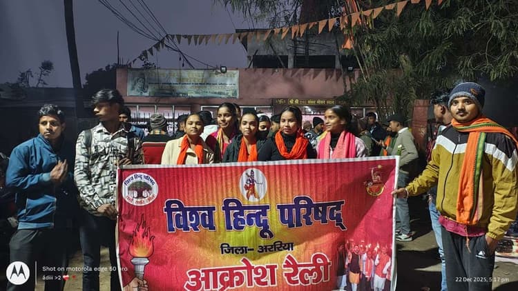 अररिया. विश्व हिंदू परिषद अररिया ने सोमवार की संध्या 05 बजे मारवाड़ी पट्टी स्थित संकट मोचन हनुमान मंदिर से काली मंदिर चौक तक एक आक्रोश मार्च निकाला. यह आक्रोश मार्च बांग्लादेश के ढाका में हिंदू युवक दीपू दास को सरेआम फांसी लगाकर निर्मम हत्या करने व उसके शव को आग लगाने जैसे कृत्य ने मानवता को तार-तार कर दिया. इसके विरोध में आक्रोश मार्च निकाला गया. बताया गया कि बंगलादेश में हिंदू अल्पसंख्यक हैं. जिहादी मानसिकता की सोच रखने वाली यूनुस सरकार ऐसी घटनाएं करा रही है. यूनुस सरकार द्वारा ऐसी जिहादी मानसिकता को करने के लिए संरक्षण दिया जा रहा है व संपूर्ण बांग्लादेश से हिंदुओं को समाप्त करने की योजना बनायी जा रही है. जो हिंदू समाज के लिए बहुत ही चिंता का विषय है. जब-जब ऐसी घटनाएं होंगी विश्व हिंदू परिषद सदैव अपने सभी इकाइयों के साथ ऐसी घटनाओं का विरोध व मुंहतोड़ जवाब देगी. इस मौके पर विभाग विशेष संपर्क प्रमुख शुभम चौधरी, राज किशोर, बजरंग दल नगर संयोजक सूरज कुमार, दुर्गा वाहिनी नगर संयोजिका श्रेया कुमारी, दुर्गा वाहिनी प्रखंड संयोजिका आरती कुमारी, प्रिंस कुमार, फिजिकल ट्रेनर राहुल कुमार, जीत कुमार, हर्ष कुमार, कुणाल कुमार, दीपक कुमार, ओम कुमार, शशि कुमार, अभय कुमार, आयुष कुमार, प्रियांशु कुमार, कृष्ण कुमार, हिमांशु कुमार, सतीश कुमार, अश्वनी कुमार, अनिल कुमार, प्रिंस कुमार, राहुल कुमार, गुलशन कुमार, धनंजय कुमार, निखिल कुमार, रौनक कुमार सहित अन्य शामिल थे.