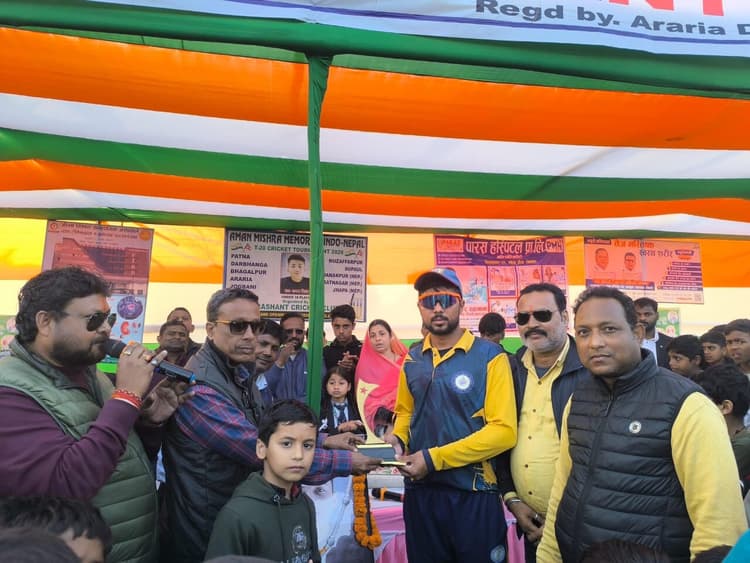 जोगबनी. प्रशांत क्रिकेट क्लब द्वारा आयोजित अमन मिश्रा मेमोरियल इंडो नेपाल क्रिकेट टूर्नामेंट में शुक्रवार को हुए मुकाबले में अररिया की टीम ने सुपौल की टीम को चार विकेट से पराजित किया. शुक्रवार को हुए मुकाबले में सुपौल की टीम ने टॉस जीतकर पहले बल्लेबाजी करने का निर्णय लिया. सुपौल ने पहले बल्लेबाजी करते हुए गुलशन कुमार के 52 रन व गगन के 51 रन की बदौलत निर्धारित 21 ओवर में 9 विकेट के नुकसान पर 179 रन बनाया. अररिया की और से उत्तम ने तीन व अमन राज ने दो विकेट हासिल किये, जवाब में बल्लेबाजी करने उतरी अररिया की टीम ने उज्जवल कुमार के शानदार 71 रन व अमन राज 30 व राजा बाबू के 25 रन की बदौलत 6 विकेट से नुकसान पर लक्ष्य हासिल कर शानदार जीत दर्ज की. वहीं अररिया टीम के उज्ज्वल को उनकी शानदार बल्लेबाजी के लिए मैन ऑफ द मैच का पुरस्कार क्लब के अध्यक्ष सुशील उर्फ दारा सिंह के द्वारा प्रदान किया गया. वहीं मैच की जानकारी प्रशांत क्रिकेट क्लब के मीडिया प्रभारी अजय उर्फ खुशबू दुबे ने दी. वहीं मैच को सफल बनाने में क्लब के जावेद, बद्दू, संतोष शर्मा, मिथिलेश झा, राकेश साह, राजा, शमशाद, सहित अन्य लोगों ने अपना योगदान दिया.
