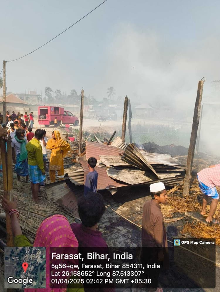 अररिया. अररिया सदर प्रखंड क्षेत्र के फरासूत गांव के वार्ड संख्या 03 में मंगलवार को एक भीषण आग लग गयी. जानकारी के अनुसार, यह आग पुआल की ढेर में लगी और पास ही स्थित एक घर में फैल गयी. इससे घर का सारा सामान जल गया. इस घटना में दो गाय भी झुलस गयी. वहीं बलवात गांव वार्ड संख्या 07 में मंगलवार की दोपहर 3 बजे के करीब एक भीषण आग लगने से चार घर पूरी तरह से जल गया. इससे घरों में रखा अनाज, कपड़ा, फर्नीचर सहित जरूरी कागजात भी जल गये. इस घटना में लाखों रुपये के नुकसान का अनुमान लगाया जा रहा है. स्थानीय निवासियों के अनुसार, आग इतनी तेजी से फैली कि उसे नियंत्रित करना मुश्किल हो गया. हालांकि, आग की सूचना मिलते ही स्थानीय अग्निशमन विभाग की टीम मौके पर पहुंची व ग्रामीणों की मदद से आग पर काबू पाया.