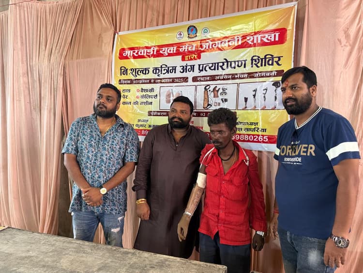 जोगबनी. मारवाड़ी युवा मंच जोगबनी द्वारा धर्मशाला रोड स्थित अग्रसेन भवन में मुफ्त कृत्रिम अंग प्रत्यारोपण शिविर लगाकर लोगों को कृत्रिम अंग प्रदान किया गया. मंच द्वारा लगाए गए शिविर में कुल 52 लोगों ने पंजीकरण कराया जिनमें से 35 लाभार्थियों को कृत्रिम अंग प्रत्यारोपण के साथ-साथ बैसाखी, कान की मशीन व अन्य आवश्यक सहायक उपकरण पूरी तरह निशुल्क प्रदान किया गया. मंच ने जाति, धर्म, पंथ से ऊपर उठकर तन, मन व धन से निःस्वार्थ सेवा भाव के साथ कार्य किया. वही दो दिवसीय शिविर का शुभारंभ जोगबनी मुख्य पार्षद प्रतिनिधि सह भाजपा जिला कोषाध्यक्ष रोहित यादव ने दीप प्रज्वलित कर किया. मौके पर मंच के अध्यक्ष सुमित अग्रवाल, सचिव विकास गोयल, कोषाध्यक्ष योगेश तापड़िया, सुमित गोयल, केशव लाहोटी, अमन अग्रवाल, प्रणय अग्रवाल, अपूर्व अग्रवाल सहित मंच के कई सक्रिय सदस्य उपस्थित रहे व सेवा कार्य में योगदान दिया.