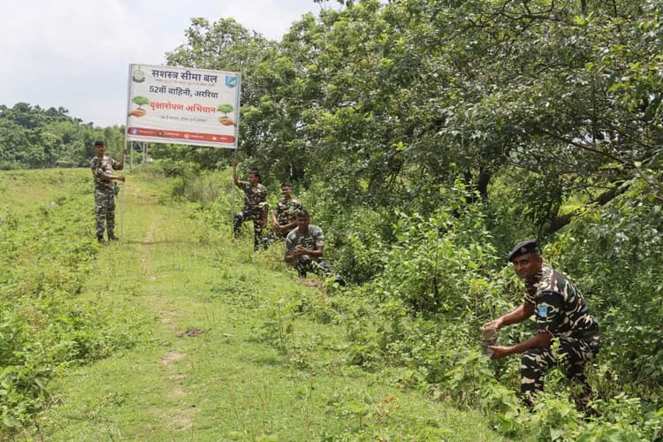 अररिया. भारत सरकार, गृह मंत्रालय के तत्वाधान में कमांडेंट महेंद्र प्रताप के निर्देशन में 52वीं वाहिनी, सशस्त्र सीमा बल, अररिया द्वारा वाहिनी मुख्यालय के निकट स्थित हरियाबाड़ा क्षेत्र में वृहत स्तर पर पौधरोपण किया गया. जिसमें विभिन्न प्रकार के बालपौधे जैसे सागवान, शीशम, अर्जुन, अशोक, नीम, अमरुद, जामुन के अवाला व अन्य प्रजाति के पौधे शामिल थे. सशस्त्र सीमा बल के द्वारा विगत कई वर्षो से केंद्र सरकार के निर्देशानुसार पौधे लगाये जा रहे हैं. कमांडेट ने कहा कि पेड़ों के अस्तित्व के बिना हम पृथ्वी पर जीवन की कल्पना भी नहीं कर सकते. पेड़ न सिर्फ हमें ऑक्सीजन देते हैं बल्कि फल, लकड़ी, फाइबर, रबर आदि और भी बहुत कुछ प्रदान करते हैं. पेड़ पशुओं व पक्षियों के लिए आश्रय का भी काम करते हैं. अधिक पेड़ लगाने का मतलब प्रदूषण को कम करना है. वायु प्रदूषण के अलावा पेड़ ध्वनि व जल प्रदूषण को कम करने में सहायता करते हैं. प्रदूषण रहित वातावरण निश्चित रूप से स्वस्थ्य है. इस वृक्षारोपण अभियान में बल कार्मिकों द्वारा बढ़ चढ़ कर भाग लिया गया.
