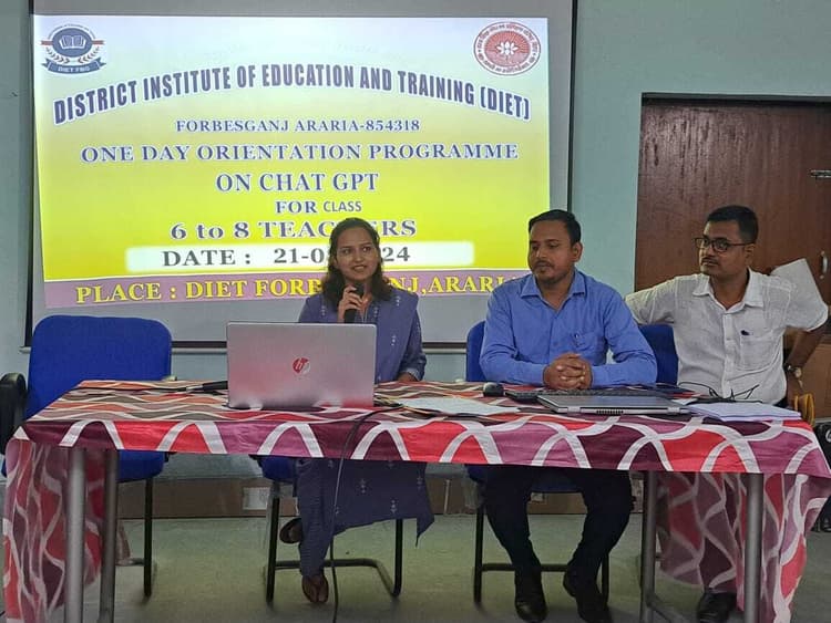 फोटो:-15- कार्यक्रम में मौजूद एसडीओ व अन्य. फारबिसगंज. जिला शिक्षा एवं प्रशिक्षण संस्थान (डायट) में पहली बार एक दिवसीय चैट जीपीटी कार्यक्रम का आयोजन किया गया. जिसमें फारबिसगंज अनुमंडल के छह से आठ शिक्षक शामिल हुए. कार्यक्रम का संचालन एसडीओ शैलजा पांडये के मार्ग दर्शन में किया गया. इस संबंध में डायट के प्राचार्य आफताब आलम ने बताया कि बुधवार को आयोजित चैट जीपीटी कार्यक्रम के अनुश्रवण के लिए एसडीओ शैलजा पांडे के द्वारा प्रशिक्षुओं से आज के समय को देखते हुए एआई, चैट जीपीटी जैसे चीजों का उपयोग विद्यालय सहित शैक्षणिक गतिविधियों में किस प्रकार दैनिक जीवन में किया जा सकता हैं. इसकी जानकारी दी गयी. साथ ही प्रशिक्षुओं को फीडबैक की भी जानकारी दी गयी. इस मौके पर डायट के प्राचार्य अफताब आलम,आईसीटी व्याख्याता नीतीश कुमार, साधनसेवी प्रेम कुमार सहित अन्य मौजूद थे. ———– कल्याण कोष की राशि बढ़ोतरी में सभी अधिवक्ता सहयोग करें: विनोद प्रसाद फोटो:-16- कल्याण कोष की बैठक में उपस्थित अधिवक्ता. अररिया. न्यायमंडल के जिला अधिवक्ता संघ स्थित लॉयर्स हॉल में बुधवार को कल्याण कोष में राशि बढ़ोतरी को लेकर बैठक आयोजित की गयी. बैठक की अध्यक्षता जिला अधिवक्ता संघ के पूर्व अध्यक्ष सह वरीय अधिवक्ता विनोद प्रसाद ने की. बैठक में कल्याण कोष से संबंधित मामलों को लेकर संघ पदाधिकारियों व अधिवक्ता सदस्यों के साथ बातचीत किया गया. कल्याण कोष में राशि बढ़ोतरी पर गहन चर्चा कर कई आवश्यक निर्णय भी पारित किया गया. जिला अधिवक्ता संघ कल्याण कोष के वर्तमान संयोजक हरिश्चन्द्र चौहान (अधिवक्ता) ने संघ के सभी विद्वान अधिवक्ताओं से अपील किया कि वे शपथपत्र के दौरान शपथपत्र फॉर्म का व्यवहार जरूर करें. इस बात को उपस्थित सभी अधिवक्ताओं ने आश्वस्त करते हुए विश्वास दिलाया कि जुलाई माह के अपेक्षा अगस्त माह में शपथपत्र फॉर्म की बिक्री में अप्रत्याशित वृद्धि होगी. बैठक को संबोधित करते हुए जिला अधिवक्ता संघ के पूर्व अध्यक्ष मो मंजूर आलम ने भी कई कारगर सुझाव दिए. जिसे करतल ध्वनि से सराहा गया. मोके पर वरीय अधिवक्ता विनोद प्रसाद, अध्यक्ष तपन बनर्जी, महासचिव छंगूरी मंडल, पूर्व अध्यक्ष मो मंजूर आलम, पूर्व महासचिव जागेश्वर भगत, संजीव कुमार सिन्हा, पूर्व उपाध्यक्ष असित कुमार वर्मा, अंकेक्षक विनीत प्रकाश, राजेंद्र चौधरी, ठाकुर शंकर कुमार, विकास कुमार पासवान, मो नोशाद आलम, सुरेंद्र मंडल, चंदन कुमार, वसंत कुमार रॉय, ललित मंडल, शैलेंद्र शरण, नीरज प्रसाद, मेनिका मिश्रा, कौशल वर्मा, विवेक प्रकाश, उदय कुमार मंडल, सुबोध कर्ण, महानंद विश्वास, सलमान रागिब, अविनाश चौहान आदि मौजूद थे.
