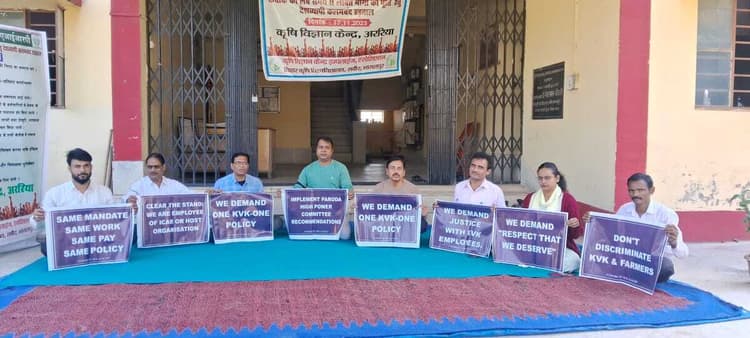 अररिया. फॉरम ऑफ केवीके व एआइसीआरपी के आह्वान पर कृषि विज्ञान केंद्रों की लंबे समय से लंबित मांगों की पूर्ति के लिए एक दिवसीय देशव्यापी कलमबंद हड़ताल का आयोजन केवीके अररिया में किया गया. इस कलमबंद हड़ताल के आयोजन में ससमय वेतन, एक समान राष्ट्रीय नीति, परोदा समिति की रिपोर्ट को लागू करना, समान कार्य समान वेतन, भेदभाव से मुक्ति, प्रोन्नति, पेंशन अंशदान, चिकित्सा भत्ता का भुगतान, रिटायरमेंट लाभ सुनिश्चित करना व देशभर के सभी कृषि विज्ञान केंद्रों में एक समान निष्पक्ष नीति लागू करना प्रमुख मांगों में रखी गयी. बताया गया कि 1974 से भारत सरकार के कार्य के लिए उसी के धनराशि से संचालित अभी फिलहाल देश भर में 731 कृषि विज्ञान केंद्र कार्यरत हैं. जिसमें कुल 88 कृषि विज्ञान केंद्र के कर्मियों को प्रोन्नति, पेंशन, ग्रेच्युटी इत्यादि सभी सुविधाएं दी जाती हैं. लेकिन शेष कृषि विज्ञान केंद्रों के साथ सौतेलापन व्यवहार करते हुए उनके कर्मियों को संवैधानिक लाभों से वंचित रखा जा रहा है. 02 साल से नवनियुक्त कर्मियों को अंशदायी पेंशन योजना के तहत नियोक्ता अंशदान भी नहीं दिया जा रहा है. जो भारत के श्रम अधिनियम के विरुद्ध है. बताया गया कि पूरे देश में कृषि विज्ञान केंद्रों के लिए शत-प्रतिशत राशि भारत सरकार द्वारा दी जाती है. एक समान कार्यादेश के अनुसार सभी केवीके में काम होते हैं. लेकिन 88 केवीके छोड़कर अन्य केवीके के कर्मियों के साथ सौतेलापन व भेदभाव अपनाया जा रहा है. हाल हीं वर्ष 2025 के जनवरी माह में बिहार कृषि विश्वविद्यालय सबौर, भागलपुर के द्वारा कुछ वैज्ञानिकों को समय पूर्व सेवानिवृत्ति कर दिया गया. अनेकों वैज्ञानिकों के प्रोन्नतियों को रद्द कर कर दिया गया. परिषद द्वारा 05 अगस्त 2025 को व पुनः 13 नवंबर को इस दिशा में निर्देश जारी करने के बावजूद बिहार कृषि विश्वविद्यालय प्रशासन अपने गलत निकाले गये आदेशों को वापस नहीं कर रहा है. इन सभी से क्षुब्ध होकर राष्ट्रीय फॉरम के आह्वान पर देशभर में सभी कृषि विज्ञान केंद्र में सोमवार 17 नवंबर को एक दिवसीय कलमबंद हड़ताल किया जा रहा है. हड़ताल पर बैठे केवीके अररिया के कर्मियों ने कहा कि यदि हमारी मांगे ससमय पूरी नहीं की जाती है तो आने वाले समय में जल्द ही सभी कर्मी विश्वविद्यालय प्रशासन का घेराव करेंगे व भारतीय कृषि अनुसंधान परिषद के अटारी कार्यालय पटना का भी घेराव कर अपनी विरोध प्रदर्शन दर्ज करेंगे. हड़ताल पर केवीके अररिया के वरीय वैज्ञानिक सह प्रधान डॉ विनोद कुमार, डॉ संजीव कुमार, सुमन कुमारी, आफताब आलम, डॉ रामनरेश, राकेश कुमार, अशोक गोस्वामी, गौतम कुमार निराला सहित अन्य शामिल थे.
