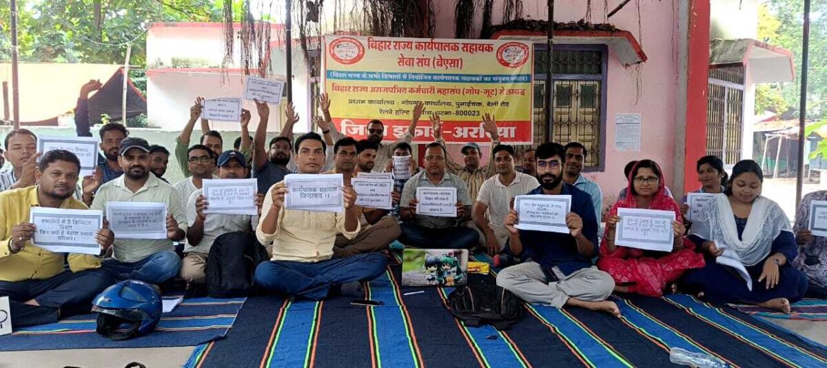 अररिया. बिहार राज्य कार्यपालक सहायक सेवा संघ के आह्वान पर जिले में कार्यपालक सहायकों का चरणबद्ध आंदोलन जारी है. इसी क्रम में रविवार को संघ के जिला इकाई के सदस्यों ने अपनी मांगों के समर्थन में जिला मुख्यालय स्थित धरना स्थल पर शांतिपूर्ण धरना दिया. धरना की अगुआई संघ के जिलाध्यक्ष मनीष कुमार ठाकुर ने की. धरना को संबोधित करते हुए उन्होंने कहा कि डिजिटल बिहार की परिकल्पना को साकार करने में कार्यपालक सहायकों की भूमिका महत्वपूर्ण है. कार्यपालक सहायक वर्षों से वेतनमान की उम्मीद लगाये बैठे हैं. उन्होंने कहा कि उनकी प्रमुख मांगों में सेवा संवर्ग का गठन का गठन कर स्थायीकरण करते हुए उन्हें राज्य कर्मी का दर्जा देने की मांग, सातवें वेतनमान की अनुशंसा के आधार पर वेतनमान का निर्धारण शामिल है. मौके पर संघ के सचिव मनीष कश्यप, विक्रम कुमार, रिंकू वर्मा, अमरेंद्र कुसुम, राणा जी, शंकर कुमार, दीपा मजूमदार, अमृता कुमारी, जुबैर अहमद, फिरोज आलम सहित दर्जनों कार्यपालक सहायक मौजूद थे.