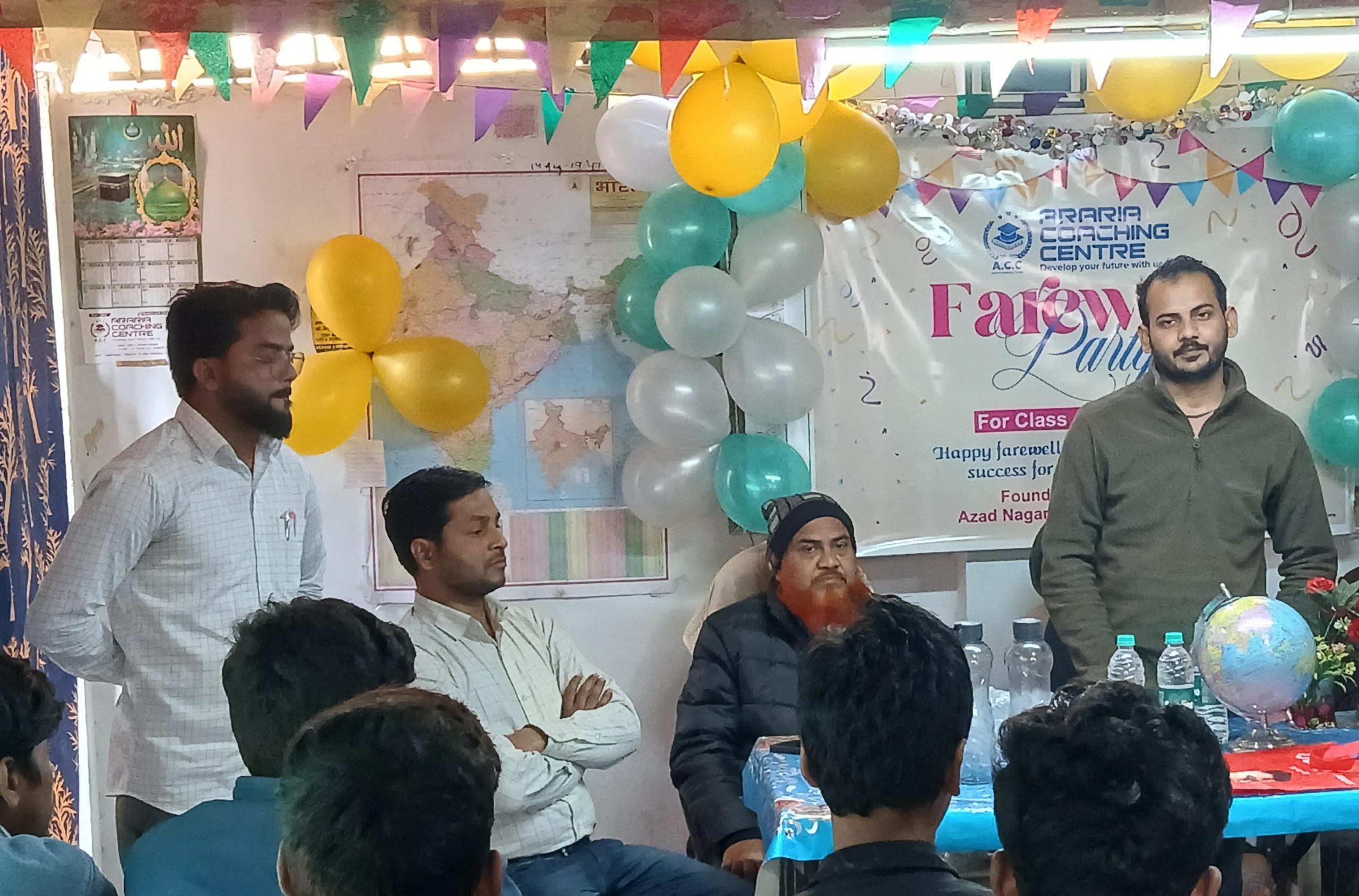 -1-प्रतिनिधि, अररिया अररिया आजाद नगर वार्ड संख्या 19 स्थित अररिया कोचिंग सेंटर में बुधवार को एक समारोह आयोजित कर 10वीं के छात्र-छात्राओं को विदाई गयी. इसमें मुख्य अतिथि के रूप में जामा मस्जिद अररिया के इमान व खतीब मौलाना आफताब आलम मुज़ाहिरी, शादाब आलम व सैयद मुजम्मिल अहमद शामिल हुए. इस मौके पर मैट्रिक परीक्षा के सेंटअप 18 छात्रों के लिए कोचिंग परिवार व जूनियर छात्र-छात्राओं ने कार्यक्रम आयोजित किये. इस मौके पर मुख्य अतिथि मौलाना आफताब आलम ने सभी बच्चों के बेहतर भविष्य की कामना करते हुए उन्हें दुआएं दी. इस अवसर पर कोचिंग के बच्चों द्वारा विभिन्न प्रकार के कार्यक्रम का आयोजन किया गया. कोचिंग के संचालक नौशाद आलम ने बताया कि हमारे यहां ज्यादा तर बच्चे मिडिल क्लास के है जो पिछले एक साल से यहां तैयारी कर रहे है. मौके पर मुजम्मिल ने सभी बच्चों से खास तौर पर इंग्लिश पर ध्यान देने की बात कही. क्योंकि इसके बगैर बाद में काफी दिक्कत होती है. साथ ही पढ़ने की आदत डालें. परीक्षा बेहतर तैयारी के साथ दें. घबराने की जरूरत नहीं है. सेंटर पर हर हाल में समय से पहले पहुंचे वरन दिक्कत हो जायेगी.