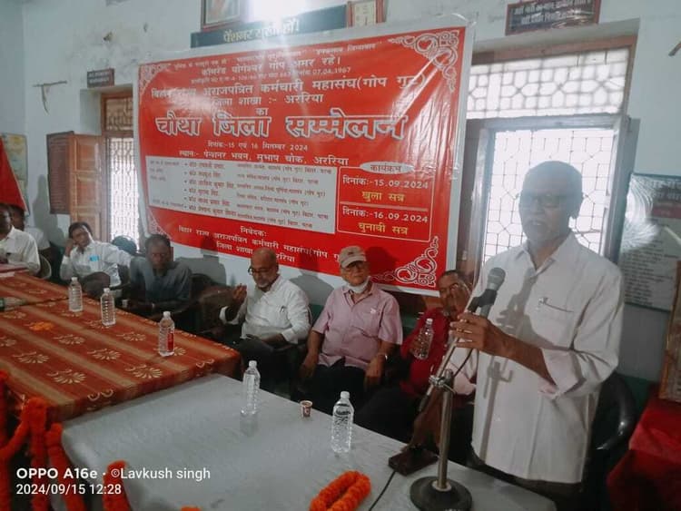 17- अररिया. बिहार राज्य अराजपत्रित कर्मचारी महासंघ गोप गुट का जिला सम्मेलन रविवार को शुरु हुआ. सुभाष चौक स्थित पेंसनर भवन में झंडोत्तोलन व पुष्पांजलि के साथ सम्मेलन का उद्घाटन महासंघ के अध्यक्ष रामबली प्रसाद ने किया. महासंघ के चौथे महा सम्मेलन में संघ से जुटे जिले भर से आये शिक्षक व विभिन्न विभाग में कर्मियों ने भाग लिया. महासंघ के अध्यक्ष ने मौके पर अपने संबोधन में कर्मचारी आंदोलन का इतिहास व महासंघ की स्थापना के उद्देश्य विस्तृत चर्चा की. उन्होंने कहा कि लंबे संघर्ष व आंदोलन के बाद ही हमें वेतन, भत्ता, अनुकंपा व 60 वर्षों तक स्थाई नौकरी की सुविधा हासिल हो पाई है. मौके को संबोधित करते हुए भाकपा माले के जिला सचिव रामविलास यादव ने अपने वाजिब हक के लिये महासंघ की जारी लड़ाई को उनकी पार्टी सड़क से संसद तक अपना समर्थन करती है. भाकपा माले के जिला सचिव डॉ कैप्शन एसआर झा ने कहा कि सभी सरकारी कर्मचारी मजदूर की श्रेणी में हो हीं आते हैं. सभी वामपंथी पार्टी हमेशा से किसान व मजदूरों के हक की लड़ाई लड़ती रही है. उन्होंने महासंघ से जुड़े कर्मियों को अपने हितों की रक्षा के लिये एकजुट होकर एक बड़े आंदोलन की नीव रखने का आह्वान किया. ताकि राज्य व केंद्र की सरकार को उनके आगे झुकना पड़े. उन्होंने कहा कि मजदूरों को श्रमिकों को आज तक जो भी अधिकार मिले हैं. उनके लिए उन्हें खड़े संघर्ष के दौर से गुजरना पड़ा है. अपने हक व अधिकारों की रक्षा के लिए एक जुट होकर संघर्ष करने की जरूरत है. इस दौरान रामबली प्रसाद, प्रेमचंद्र सिंह, लवकुश सिंह, बानेश्वर वर्मा, हीरानंद पासवान, रवीश कुमार यादव, अजीत कुमार सिंह, पूजा कुमारी, विनीता कुमारी, कुमारी रानी सहित महासंघ की अन्य सदस्य मौजूद थे. कार्यक्रम का संयोजन दामोदर शर्मा ने किया. —————— 470 बोतल शराब बरामद, तस्कर फरार नरपतगंज. फुलकाहा थानाध्यक्ष अमित कुमार के नेतृत्व में पुलिस टीम ने घूरना-अंचरा सड़क मार्ग में भवानीपुर के समीप 470 बोतल नेपाली शराब बरामद कर थाना लाया. जबकि शराब तस्कर पुलिस को देखते ही बाइक से शराब लदी बोरा गिराकर फरार हो गया. बोरा की तलाशी लेने पर 470 बोतल शराब जब्त कर लिया गया.