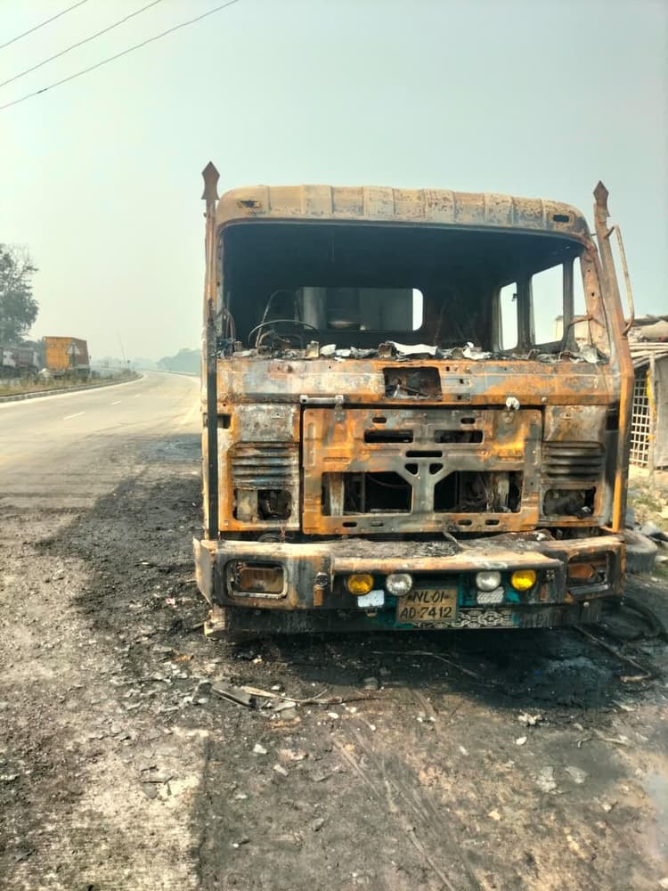 जला हाइवा, बाल-बाल बचे चालक व खलासी