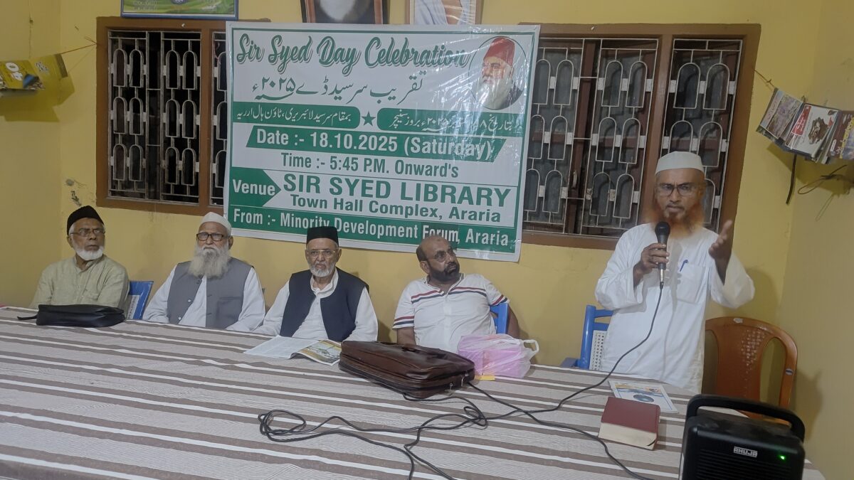 अररिया. माइनोरिटी डेवलपमेंट फोरम अररिया के सौजन्य से सर सैयद डे के मौके पर शनिवार को सर सैयद लाइब्रेरी में एक विचार गोष्ठी का आयोजन किया गया. इसकी अध्यक्षता एडीएफ के जिलाध्यक्ष इं ज़ुबैर आलम ने की. इस मौके पर एमडीएफ के पदाधिकारी मो मोहसिन, सैयद शमीम अनवर, डॉ नैय्यर हबीब, मौलाना जियाउर रहमान मदनी, शम्स आजम, इं सरवर आलम, फैसल यासीन जावेद, अरशद अनवर अलग, मौलाना अफ़रोज़ आलम फलाही, मो तारिक शहबाज, अफ़्फान कामिल, तौसीफ अनवर के अलावा शहर के अन्य गणमान्य लोग मौजूद थे. कार्यक्रम की शुरुआत तिलावते कलाम पाक से हुई. इसके बाद रोज वैली स्कूल के बच्चों के द्वारा अलीगढ़ का तराना पेश किया गया. इस गोष्ठी में वक्ताओं ने मुख्य रूप से सर सैयद अहमद खान कैसा के अदबी व तालीमी खिदमात पर विशेष रूप से चर्चा की. इस मौके पर मिल्लत फाउंडेशन के द्वारा डॉ नैय्यर हबीब ने कई लोगों को सम्मानित भी किया. इस मौके पर अलीगढ़ मुस्लिम यूनिवर्सिटी के संस्थापक, महान चिंतक व आधुनिक व तकनीकी शिक्षा के जनक सर सैयद अहमद खान के जीवनी व उनके द्वारा समाज सुधार के क्षेत्र में किए गए कार्यों की चर्चा की गयी. साथ ही मौजूद लोगों के द्वारा उनकी 208 वीं जयंती पर श्रद्धांजलि दी गयी.