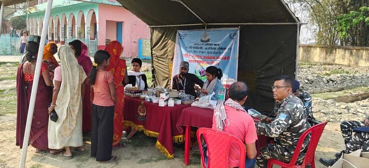 कुर्साकांटा. शुक्रवार को एसएसबी 52वीं वाहिनी अररिया के कमांडेंट महेंद्र प्रताप के निर्देशन में बाह्य सीमा चौकी डुमरिया के कार्यक्षेत्र के अंतर्गत आने वाले वाइब्रेंट विलेज सुंदरी के उच्च माध्यमिक विद्यालय में व बाह्य सीमा चौकी लैलोखर के कार्यक्षेत्र के अंतर्गत आनेवाले वाइब्रेंट विलेज लैलोखर के उमवि लैलोखर में चिकित्सा शिविर का आयोजन किया गया. जिसमें पीएचसी कुर्साकांटा के डॉ तजम्मुल हक ने स्थानीय नागरिकों के स्वास्थ्य की जांच कर मरीजों के बीच नि:शुल्क दवाइयों का वितरण किया गया. शिविर में 34 पुरुष, 53 महिला व 18 बच्चों सहित कुल 105 मरीजों की जांच की गयी. साथ ही डॉ तजम्मुल हक ने शिविर में मौजूद स्थानीय लोगों को बदलते मौसम को ध्यान में रखते हुए जरुरी दिशा-निर्देश व खान-पान से संबंधित आवश्यक जानकारी दी गयी. शिविर में श्री अन्न (मोटे अनाज) के फायदे व उसका उपयोग करने, साफ-सफाई, नशे से होने वाले दुष्प्रभाव व बेटी बचाओ बेटी पढ़ाओ विषय पर ग्रामीणों को जागरूक किया गया. इसके अतिरिक्त शिविर में ग्रामीणों को स्थानीय स्तर पर फल व सब्जियों के उत्पादन के लिए भी प्रोत्साहित किया गया. इस कार्यक्रम में डॉ तजम्मुल हक, स उपनिरीक्षक डब्लू रणजीत सिंह, एएनएम भानुप्रिया व मोनिका कुमारी, आरक्षी सचिन कासार सहित अन्य अधिकारी व कार्मिक शामिल थे.