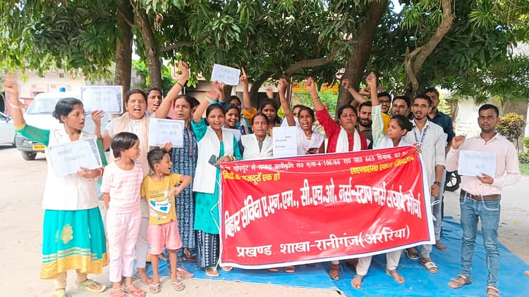 फोटो:-10-धरना प्रदर्शन करते एनएचएम कर्मी. प्रतिनिधि, फारबिसगंज एफआरएएस सिस्टम को लागू किये जाने के विरोध में व 10 सूत्री मांगों के समर्थन में प्रखंड क्षेत्र में कार्यरत एनएचएम स्वास्थ्य कर्मियों ने धरना प्रदर्शन कर विरोध जताया. इस क्रम में शुक्रवार को प्रखंड क्षेत्र में कार्यरत सभी एनएचएम कर्मी पीएचसी कार्यालय पहुंच कर बिहार संविदा संघर्ष मोर्चा के बैनर तले पीएचसी कार्यालय में धरना प्रदर्शन किया. धरना प्रदर्शन के दौरान ये सभी एनएचएम कर्मियों ने कार्य का भी बहिष्कार किया. पीएचसी कार्यालय में धरना प्रदर्शन कर रहे एनएचएम कर्मियों ने 10 सूत्री मांगों के संदर्भ में बताया कि कहा कि 10 सूत्री मांग है कि समान काम के बदले समान वेतन दिया जाये, राष्ट्रीय स्वास्थ्य मिशन के तहत संविदा पर कार्यरत सभी कर्मियों को बिना शर्त राज्य कर्मी का दर्जा दिया जाय, एनएचएम के सभी कर्मियों पर अशोक चौधरी की अध्यक्षता वाली उच्च स्तरीय समिति की अनुशंसा को लागू किया जाय सहित अन्य मांगे शामिल हैं. मौके पर सीताराम बैरवा,गिरीश कुमार,संदीप सैनी,रुचि कुमारी, गायत्री कुमारी, वर्षा रानी, दिलखुश मीणा, हिमाद्री कुमारी सहित अन्य कर्मी शामिल थे. —————- एनएचएम कर्मियों ने किया काम का बहिष्कार -9- अररिया. एनएचएम कर्मियों ने शुक्रवार को सदर अस्पताल अररिया व प्राथमिक स्वास्थ्य केंद्र अररिया में काम का बहिष्कार करते हुए एक जुट होकर प्रदर्शन करते हुए हड़ताल पर चले गये. सभी स्वास्थ्य कर्मियों ने जारी फेस रिकग्निशन अटेंडेंस सिस्टम को वापस लेने की मांग रखी. साथ ही समान काम समान वेतन की मांग सहित अपनी 10 सूत्रीय मांगों को लेकर एक ज्ञापन सीएस न अररिया को सौंपा. स्वास्थ्य कर्मियों ने कहा की जब तक जारी एफआरएएस वापस नहीं ले लेते हैं तब तक सभी संविदा स्वास्थ्य कर्मी हड़ताल पर ही रहेंगे. वहीं संविदा स्वास्थ्य कर्मी के हड़ताल पर चले जाने से सदर अस्पताल अररिया व प्राथमिक स्वास्थ्य केंद्र अररिया में मरीजों को भी इलाज में काफी परेशानी का सामना उठाना पड़ा. इस मौके पर अध्यक्ष वंदना कुमारी, सचिव कमलेश कुमार, उपाध्यक्ष मुकेश कुमार मीणा, चंद्रकांत मीणा, देशराज, अनिल कुमार, रामदयाल चौधरी, महेंद्र शर्मा, आशीष, नीतीश कुमार सहित अन्य स्वास्थ्य कर्मी मौजूद थे. —————— एनएचएम कर्मी गये अनिश्चतकालीन हड़ताल पर फोटो-7- प्रदर्शन करते स्थानीय कर्मी. प्रतिनिधि, भरगामा बिहार चिकित्सा व जन स्वास्थ्य कर्मचारी संघ के आह्वान पर पीएचसी भरगामा में राष्ट्रीय स्वास्थ्य मिशन के तहत कार्यरत कर्मी अपनी 10 सूत्री मांगों के समर्थन में अनिश्चितकालीन हड़ताल पर चले गए. सभी कर्मियों ने पीएचसी गेट पर अपनी मांगों के समर्थन में प्रदर्शन करते हुए एक आवेदन प्रभारी चि