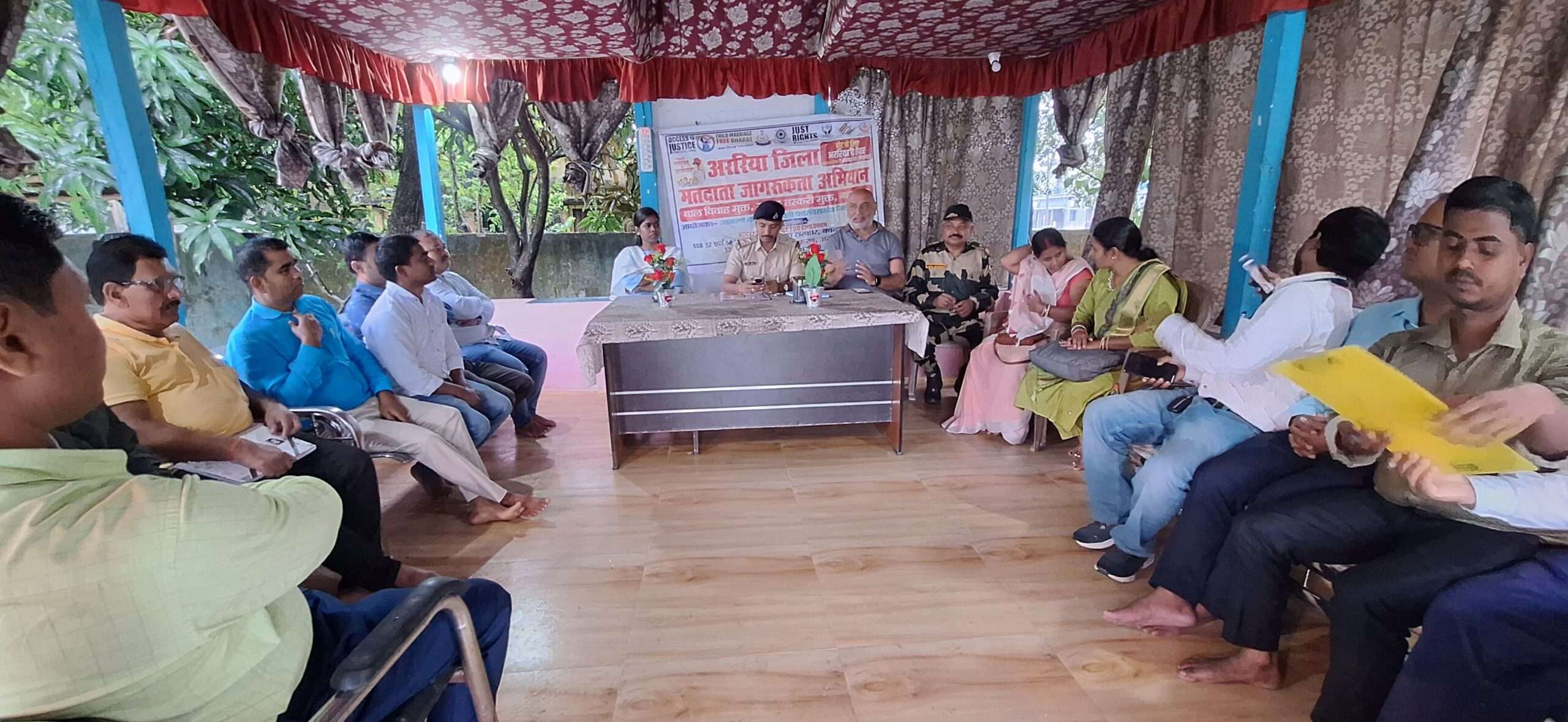 कुर्साकांटा. कुर्साकांटा थाना परिसर में शुक्रवार को जागरण कल्याण भारती फारबिसगंज, जस्ट राइट फॉर चिल्ड्रन नयी दिल्ली, जिला विधिक सेवा प्राधिकरण अररिया, एसएसबी 52वीं वाहिनी अररिया व एसएसबी 56वीं वाहिनी बथनाहा के संयुक्त तत्वावधान में राष्ट्रीय एकता दिवस पर मतदाता जागरूकता अभियान, बाल विवाह उन्मूलन, मानव तस्करी, नशामुक्ति जैसी कुरीति विषयों पर कार्यक्रम आयोजित किया गया. कार्यक्रम की अध्यक्षता थानाध्यक्ष रोहित कुमार ने की. मंच संचालन जागरण कल्याण भारती के अध्यक्ष संजय कुमार ने किया. कार्यक्रम में मुख्य अतिथि के रूप में बीडीओ नेहा कुमारी,बीएसएफ के एएसआई अनिल कुमार जागरण कल्याण भारती के डीसी दीपक कुमार, प्लस टू हाई स्कूल कुर्साकांटा के शिक्षक व छात्र मौजूद थे. कार्यक्रम में प्लस टू हाई स्कूल कुर्साकांटा के शिक्षकों ने उपस्थित लोगों को भयमुक्त वातावरण में पहले मतदान फिर जलपान, लोकतंत्र को मजबूत करने में मतदान की भूमिका सहित बाल विवाह जैसी सामाजिक कुरीतियों को उखाड़ फेंकने, बढ़ रहे मानव तस्करी पर अंकुश लगाने सहित अन्य विषयों पर विस्तृत चर्चा की गयी. वहीं आगामी 11 नवंबर 2025 को अपने अपने बूथ पर मतदान करने की अपील की.