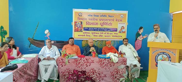 :-9- प्रतिनिधि, फारबिसगंज सुलोचना देवी डॉ डीएल दास सरस्वती शिशु विद्या मंदिर कटहरा में शुक्रवार को विभाग स्तरीय प्रधानाचार्यों की बैठक हुई. जहां पूर्णिया विभाग के अररिया, पूर्णिया, किशनगंज एवं कटिहार जिले में संचालित विद्या भारती विद्यालय के 20 प्रधानाचार्य शामिल हुए. बैठक का शुभारंभ आगंतुक अतिथियों ने दीप प्रज्वलित एवं सरस्वती वंदना के साथ किया. मुख्य अतिथि लोक शिक्षा समिति बिहार के प्रदेश सचिव रामलाल सिंह ने कहा कि पांच प्राण छात्र, अभिभावक, आचार्य, पूर्व छात्र, प्रबंध समिति विद्यालय के सर्वांगीण विकास में महत्वपूर्ण भूमिका निभाते हैं. इनके समन्वय से विद्यालय की कार्य योजना बनाई जानी चाहिए. जिसका केंद्र बालक होना चाहिए व यह भारतीय शिक्षा के मूल्यों से जुड़ा हो. उन्होंने राष्ट्रीय शिक्षा नीति 2020 की क्रियान्वयन को लेकर आवश्यक दिशा निर्देश दिये. बैठक में शैक्षिक गतिविधि, कार्ययोजना, संख्या वृद्धि, संकुल, विभाग व प्रांत स्तरीय कार्यक्रमों में सहभागिता को लेकर आवश्यक चर्चा विमर्श की गयी. सह शैक्षिक गतिविधियों में योग, संगीत, शारीरिक और खेलकूद में भैया-बहनों के साथ विद्यालय की सहभागिता सुनिश्चित करने पर बल दिया गया. अतिथियों का परिचय प्रधानाचार्य सुदर्शन कुमार ने किया. धन्यवाद ज्ञापन स्थानीय विद्यालय के अध्यक्ष राम प्रकाश प्रसाद ने किया.