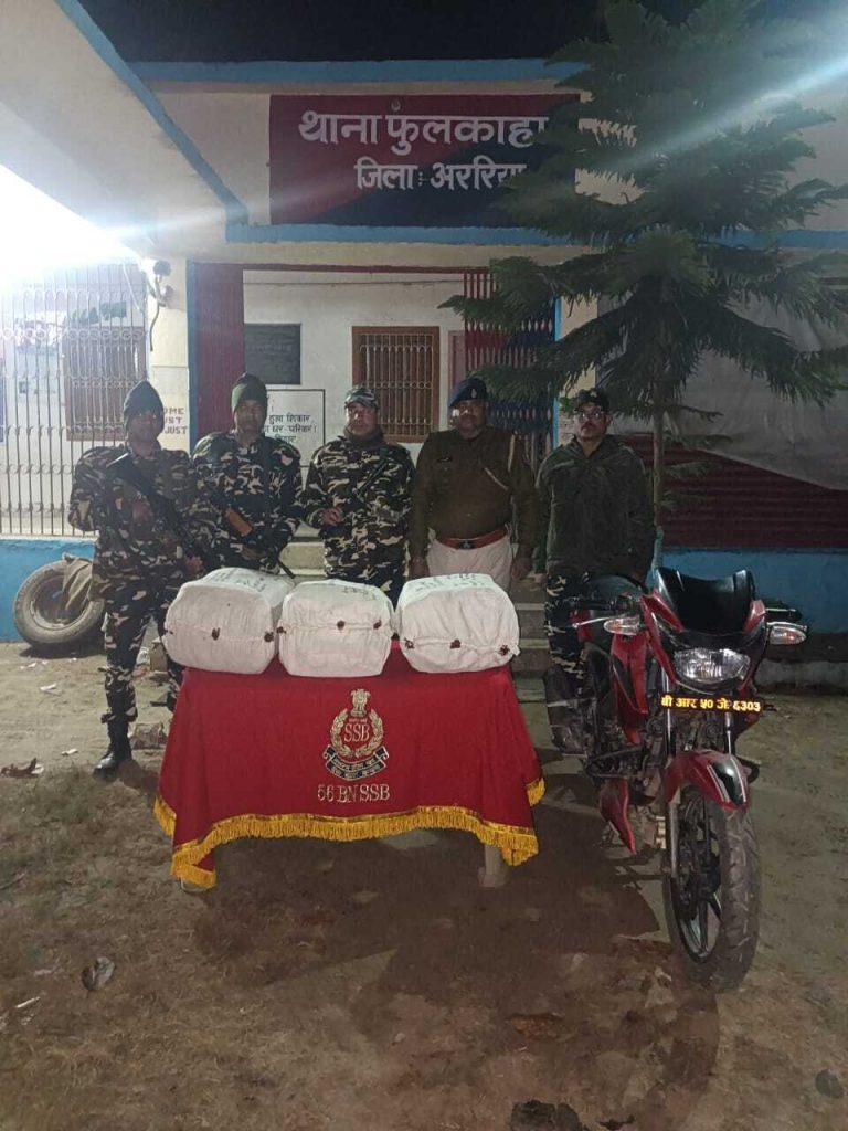 प्रतिनिधि, नरपतगंजफुलकाहा पुलिस व एसएसबी जवानों ने गुप्त सूचना के आधार पर छापेमारी अभियान चलाते हुए गुरुवार की शाम इंडो-नेपाल सीमांकन पिलर संख्या 187 के समीप कोशिकापुर गांव से एक बाइक सहित 45 किलो गांजा जब्त किया. जबकि इस कार्रवाई में तस्कर पुलिस को देखते ही मौके पर से फरार हो गया. मामले को लेकर फुलकाहा थानाध्यक्ष रौनक कुमार सिंह ने बताया कि फरार तस्कर को चिह्नित कर लिया गया है. जल्द ही गिरफ्तार कर लिया जायेगा.