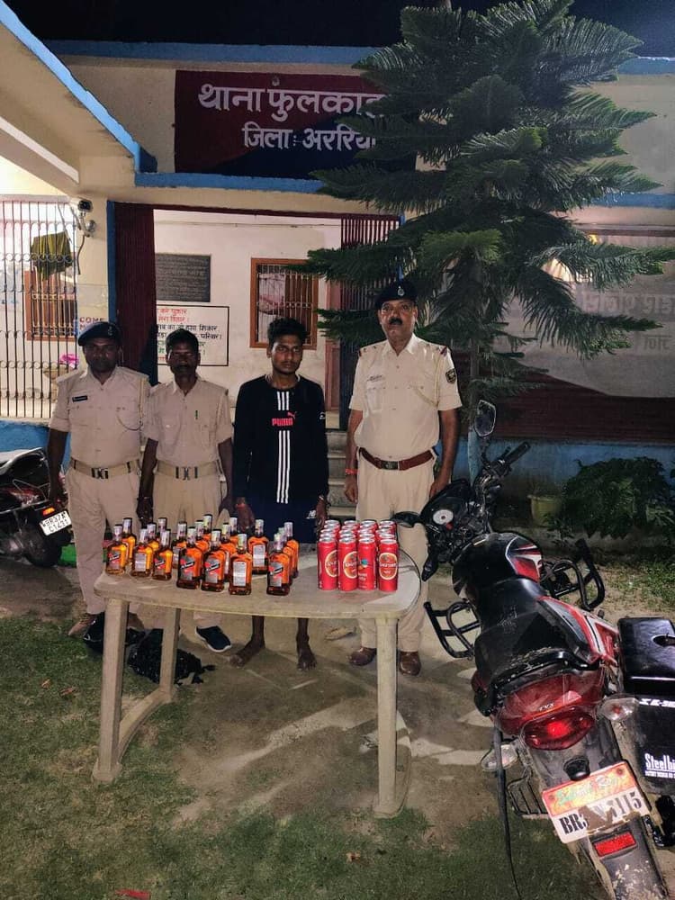-11-प्रतिनिधि, नरपतगंज फुलकाहा पुलिस ने गुरुवार रात्रि गुप्त सूचना के आधार पर इंडो नेपाल सीमा सड़क पर मानिकपुर गांव के समीप 18 बोतल नेपाली शराब व 20 बोतल बियर के साथ बाइक सवार एक तस्कर को गिरफ्तार किया है. गिरफ्तार तस्कर में रानीगंज थाना क्षेत्र अंतर्गत जगता खरसाही वार्ड संख्या चार निवासी रौशन कुमार पिता नंदन प्रधान है.बाइक सवार तस्कर गुरुवार रात्रि 18 बोतल नेपाली शराब व 20 बोतल बियर नेपाल से बार्डर के रास्ते चोरी की बाइक के साथ मानिकपुर से फुलकाहा की ओर ओर जा रहा था. इसी बीच पुलिस ने गिरफ्तार कर लिया. मामले को लेकर फुलकाहा थानाध्यक्ष दीपक कुमार ने बताया गिरफ्तार तस्कर से आवश्यक पूछताछ के बाद न्यायिक हिरासत में भेज दिया गया.