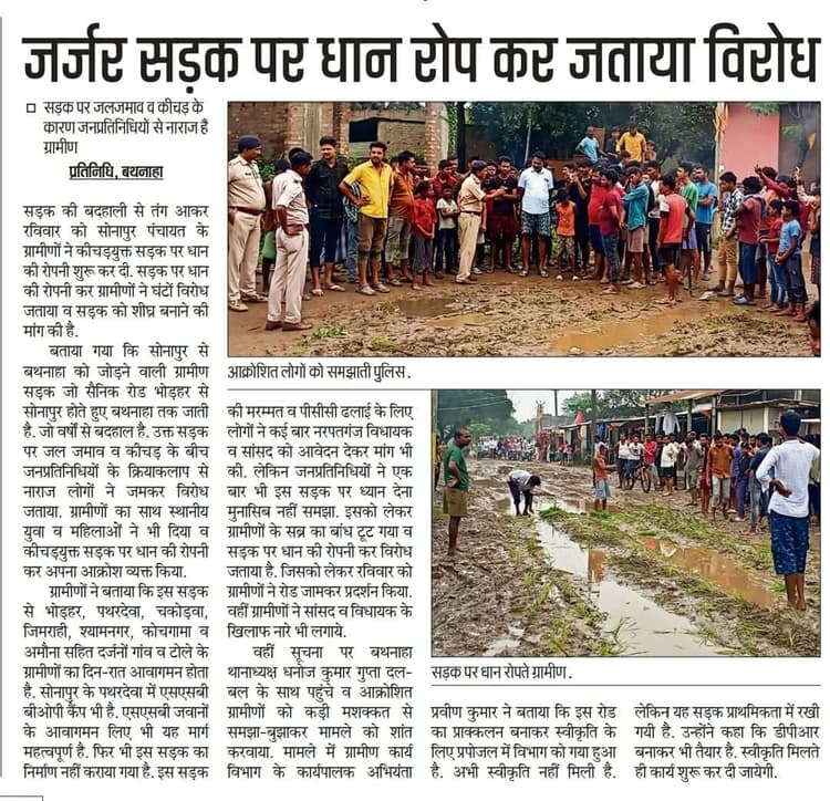प्रभात इंपैक्ट बथनाहा. बथनाहा-सोनापुर सड़क मार्ग अरसे से मरम्मत की बाट जोह रहा है. रोजाना हजारों की आबादी इन बदहाल रास्तों से आती-जाती है .7.5 किलोमीटर के इस सड़क मार्ग में जर्जर रास्ते से परेशान हैं लोग. लेकिन सड़क बन नहीं पायी है. बथनाहा से सोनापुर, भोड़हर सैनिक रोड तक जोड़ने वाली ये जर्जर सड़क विकास की पोल खोल रही है. आलम यह है कि सड़क पर कई-कई फीट गहरे गड्ढे हो गये हैं. अब इन सड़कों से वाहनों की निकासी तो दूर, सुरक्षित पैदल चलना भी मुश्किल हो गया है. गौरतलब है कि इस सड़क का निर्माण को लेकर नरपतगंज विधायक जयप्रकाश यादव ने सदन में पिछले शीतकालीन सत्र में सोनापुर की सड़क का प्रस्ताव रख प्रशासनिक स्वीकृति की मांग किया था, जहां मुख्यमंत्री ग्रामीण कार्य विभाग ने निधि की उपलब्धता होने के बाद कार्रवाई की बात कही थी. मालूम हो कि पिछले वर्ष 2024 में इस जर्जर सड़क पर आक्रोशित सोनापुर के ग्रामीणों ने धान रोपकर विरोध जताया था, जिससे प्रभात खबर में प्रमुखता से खबर को छापा था. इस बाबत फारबिसगंज कार्यपालक अभियंता प्रवीण कुमार ने बताया कि इस सड़क की स्वीकृति मिल चुकी है. बरसात का सीजन को देखते हुए अगले एक सप्ताह के अंदर निर्माण कार्य प्रारंभ कर दिया जायेगा, सड़क में मटेरियल गिराने की व्यवस्था भी की जा रही है. 2