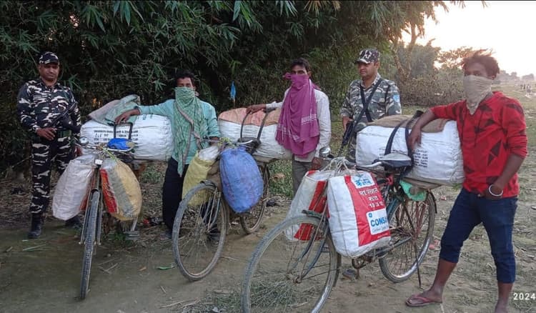 जोगबनी. एसएसबी 56वीं वाहिनी तेलियारी बीओपी के जवानों ने पिलर संख्या 183/13 मधुबनी गांव के समीप नेपाल से तस्करी कर भारतीय क्षेत्र में प्रवेश कर रहे तीन साइकिल सवारों को 260 किलो लहसुन के साथ गिरफ्तार किया गया. गिरफ्तार तस्कर में प्रदीप दास, पिता सिंहेश्वर दास अमौना, मो फिरदौस पिता जैनुल श्यामनगर सोनापुर वार्ड 12 व मो शोएब पिता जैनुल श्यामनगर निवासी बताया जा रहा है. तीनों साइकिल सवार नेपाल की ओर से भारतीय क्षेत्र में लहसुन बोरी में लाद कर प्रवेश कर रहे थे. इस बीच एसएसबी को सूचना मिली कि कुछ प्रतिबंधित सामान नेपाल से भारतीय क्षेत्र में लाया जा रहा है. सूचना मिलते ही जोगबनी कैंप प्रभारी पशुपति सिंह के नेतृत्व में टीम लीडर कुलदीप के साथ अन्य दो जवानों के साथ उक्त स्थान पर गश्ती दल को भेजा गया. जहां से तीनों साइकिल सवार को रोक कर जांच की गयी. साइकिल पर लदे बोरी में प्रतिबंधित चाइनीज लहसुन पाया गया. जिसे एसएसबी द्वारा जब्त कर लिया गया. एसएसबी द्वारा जब्त की गयी लहसुन की जब्ती सूची बनाकर फारबिसगंज कस्टम कार्यालय को सुपुर्द कर दिया कर दिया गया. —- दो आरोपित गिरफ्तार परवाहा. रानीगंज पुलिस ने सोमवार की रात्रि थाना कांड 559/24 के दो आरोपित को गिरफ्तार किया है. गिरफ्तार आरोपित थाना क्षेत्र के कमलपुर वार्ड 13 निवासी अजीम व मोसीम शामिल है. थानाध्यक्ष निर्मल कुमार यादवेंदु ने गिरफ्तार दोनों आरोपित से आवश्यक पूछताछ के बाद मंगलवार को न्यायिक हिरासत में भेज दिया गया. ——- दो वारंटी गिरफ्तार बथनाहा. थाना क्षेत्र के बराटपुर में पुलिस ने सोमवार को छापेमारी कर दो वारंटी को गिरफ्तार कर लिया. गिरफ्तार वारंटी में संजय मंडल व लक्ष्मण मंडल है. थानाध्यक्ष धनोज कुमार गुप्ता ने बताया कि दोनों वारंटी के खिलाफ न्यायालय से वारंट निर्गत हुआ था. जिसे सोमवार को गिरफ्तार किया गया. गिरफ्तार वारंटी से आवश्यक पूछताछ के बाद मंगलवार को न्यायिक हिरासत में भेज दिया गया.