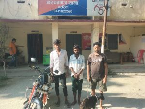 नरपतगंज. प्रखंड क्षेत्र के वरदाहा गांव में सोमवार की शाम खस्सी चोरी कर भाग रहे बाइक सवार तीन युवक को ग्रामीणों ने पकड़कर पिटाई कर दी. इसके बाद नरपतगंज पुलिस के हवाले कर दिया. नरपतगंज पुलिस ने तीनों युवकों से पूछताछ के बाद मंगलवार को न्यायिक हिरासत में भेज दिया. गिरफ्तार आरोपित फतेहपुर पंचायत के वार्ड संख्या 04 निवासी सौरभ कुमार पिता कृत्यानंद मंडल, अर्जुन मंडल पिता परशुराम मंडल व बिरजू कुमार मंडल पिता रामफल मंडल है. जानकारी अनुसार वरदाहा के समीप सड़क किनारे वरदाहा निवासी रामप्रवेश सिंह पिता स्व भुवनेश्वरी सिंह का खस्सी सड़क किनारे बंधा था. इसी बीच बाइक पर सवार तीन युवक उसको बाइक पर लेकर भागने लगा. इसी दौरान कुछ ग्रामीणों के नजर खस्सी पर पड़ गयी. इसके बाद ग्रामीणों ने पीछा कर तीनों युवक को खस्सी के साथ पकड़ कर तीनों की पिटाई कर दी. नरपतगंज पुलिस को मामले की जानकारी दी गयी. मौके पर पहुंचे पुलिस टीम ने तीनों युवकों को खस्सी के साथ गिरफ्तार कर थाना लाया. वहीं पीड़ित रामप्रवेश सिंह ने नरपतगंज थाना में आवेदन देकर न्याय की गुहार लगायी है. मामले को लेकर थानाध्यक्ष कुमार विकास ने बताया कि पीड़ित के आवेदन पर मामला दर्ज कर लिया गया है. गिरफ्तार तीनों युवकों से आवश्यक पूछताछ के बाद मंगलवार को न्यायिक हिरासत में भेज दिया गया.