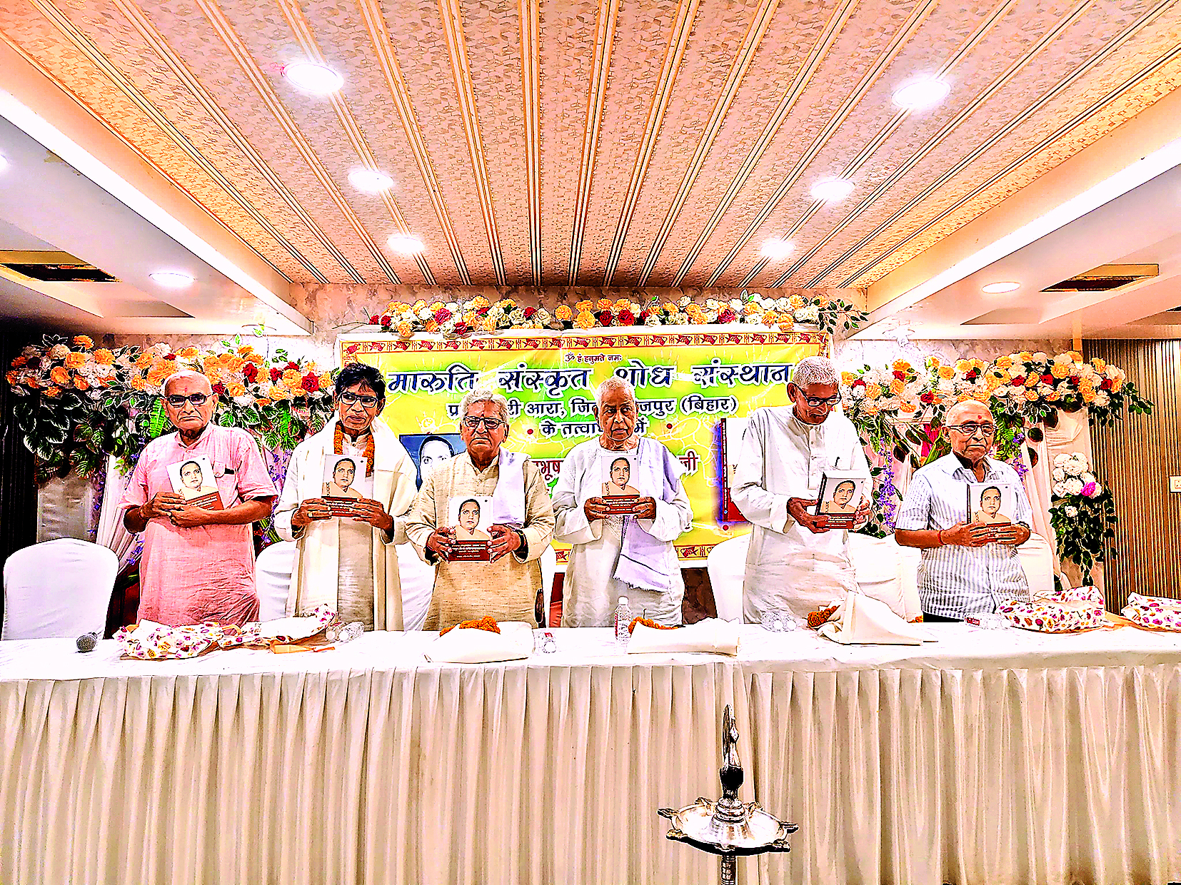 आरा. मारुति संस्कृत शोध संस्थान के तत्वावधान में पंडित व्रजभूषण मिश्र आक्रांत जी की 96वीं जयंती एवं स्मृति ग्रंथ विमोचन समारोह होटल आरा ग्रांड में आयोजित किया गया. समारोह में शिक्षा, साहित्य और संस्कृत के क्षेत्र से जुड़े विद्वानों ने भाग लिया. कार्यक्रम का शुभारंभ दीप प्रज्वलन और हनुमंत वंदना से हुआ, जिसमें पूर्णिमा पांडेय ने अर्घ्यं ग्रंथ से ”नमामि वायुनंदनम्” प्रस्तुत किया. स्वागत गायन का जिम्मा कालिंदी भारद्वाज और कल्पना भारद्वाज ने निभाया. कार्यक्रम की अध्यक्षता प्रो. महेश सिंह ने की, मुख्य अतिथि प्रो. नंद जी दूबे और विशिष्ट अतिथि प्रो. गौरीशंकर तिवारी उपस्थित थे. रामेश्वर मिश्रा ने आक्रांत जी की पठन-पाठन पद्धति और उनके विद्यालयों में योगदान पर प्रकाश डाला. सुरेंद्र सिंह ने संपादित पत्रिकाओं का परिचय दिया, जबकि राजेंद्र पाठक ने संस्कृत शिक्षा में उनके नवाचारों को रेखांकित किया. राजीव नयन अग्रवाल ने आक्रांत जी से जुड़े पारिवारिक और शैक्षणिक अनुभव साझा किये. दीपक वर्धन, राज सिंह, गौरीशंकर तिवारी और पूर्णिमा पांडेय ने आक्रांत जी पर काव्य पाठ प्रस्तुत किया. मुख्य अतिथि नंदन जी दूबे ने आक्रांत जी को राष्ट्र निर्माता बताते हुए कहा, ”आचार्य केवल पढ़ाते नहीं, वे विद्वता पढ़ाते और राष्ट्र को गढ़ते हैं.” समारोह में आक्रांत जी के अव्यावसायिक आलेखों का ग्रंथ रूप में प्रकाशन और स्मृति ग्रंथ विमोचन भी किया गया. उनके पौत्र शशि रंजन मिश्रा ने रचनाओं के संरक्षण का महत्व बताया. कार्यक्रम का समापन धन्यवाद ज्ञापन से हुआ.