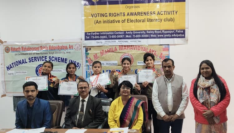 . महंथ महादेवानंद महिला महाविद्यालय में राष्ट्रीय मतदाता दिवस के अवसर पर एक कार्यक्रम का आयोजन किया गया. कार्यक्रम कॉलेज के एनएसएस तथा लिटरेरी क्लब एवं एमिटी विश्वविद्यालय,पटना के इलेक्टोरल लिटरेरी क्लब के द्वारा संयुक्त रूप में किया गया. कार्यक्रम का उद्घाटन प्राचार्य प्रोफेसर डॉ नरेंद्र प्रताप पालित, डॉ स्मृति चौधरी, एमिटी विश्वविद्यालय के कुंदन कुमार ने किया. प्राचार्य प्रोफेसर पालित ने कहा कि भारत लोकतंत्र की जननी है तथा यह बुद्ध काल में यहां प्रचलित था. भारत का लोकतंत्र विश्व का सबसे बड़ा लोकतंत्र है. लोकतंत्र की सफलता का आधार मतदान हैं, इसलिए अधिक से अधिक मतदाताओं को लोकतंत्र में अपना मतदान करना चाहिए. मतदान प्रलोभन हीन तथा स्वविवेक से करना चाहिए. इस अवसर पर एमिटी विश्वविद्यालय द्वारा निबंध लेखन तथा पोस्टर प्रतियोगिता का आयोजन किया गया. इसमें 44 छात्राओं ने भाग लिया. प्रियांशी सिंह, कल्पना कुमारी, कोमल कुमारी, मुस्कान कुमारी तथा अनुपम प्रभा को मतदाता जागरूकता अभियान में अच्छे कार्य के लिए मेडल देकर सम्मानित किया गया. इस अवसर पर प्रो राजीव कुमार, डॉ मनोज कुमार, डॉ तसनीम फातिमा, डॉ अनुपमा, डॉ स्मिता, डॉ सुमाइला, डॉ पूनम, डॉ सरोज, डॉ अमरेश, डॉ राकेश, डॉ युगल आदि शिक्षक उपस्थित थे.