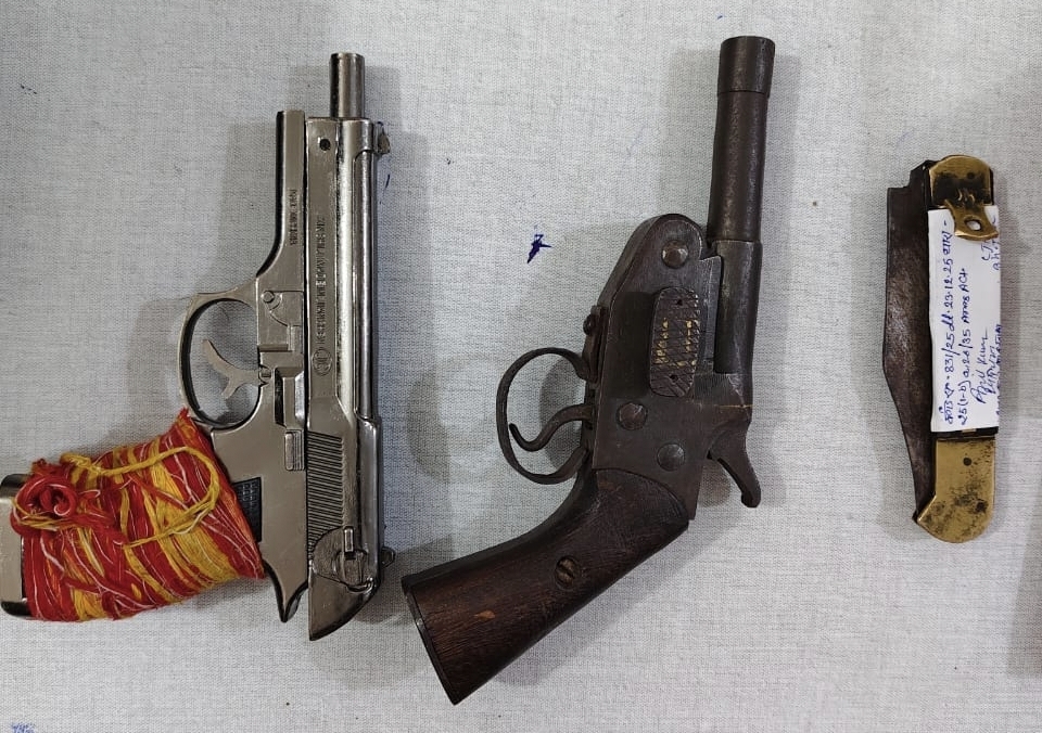 नवादा थाना क्षेत्र के बिहारी मिल के पास मंगलवार की रात पकड़ा गया बदमाश गिरफ्तार बदमाश के पास से एक कट्टा, एक लाइटर गन, एक चाकू और दो मोबाइल बरामद