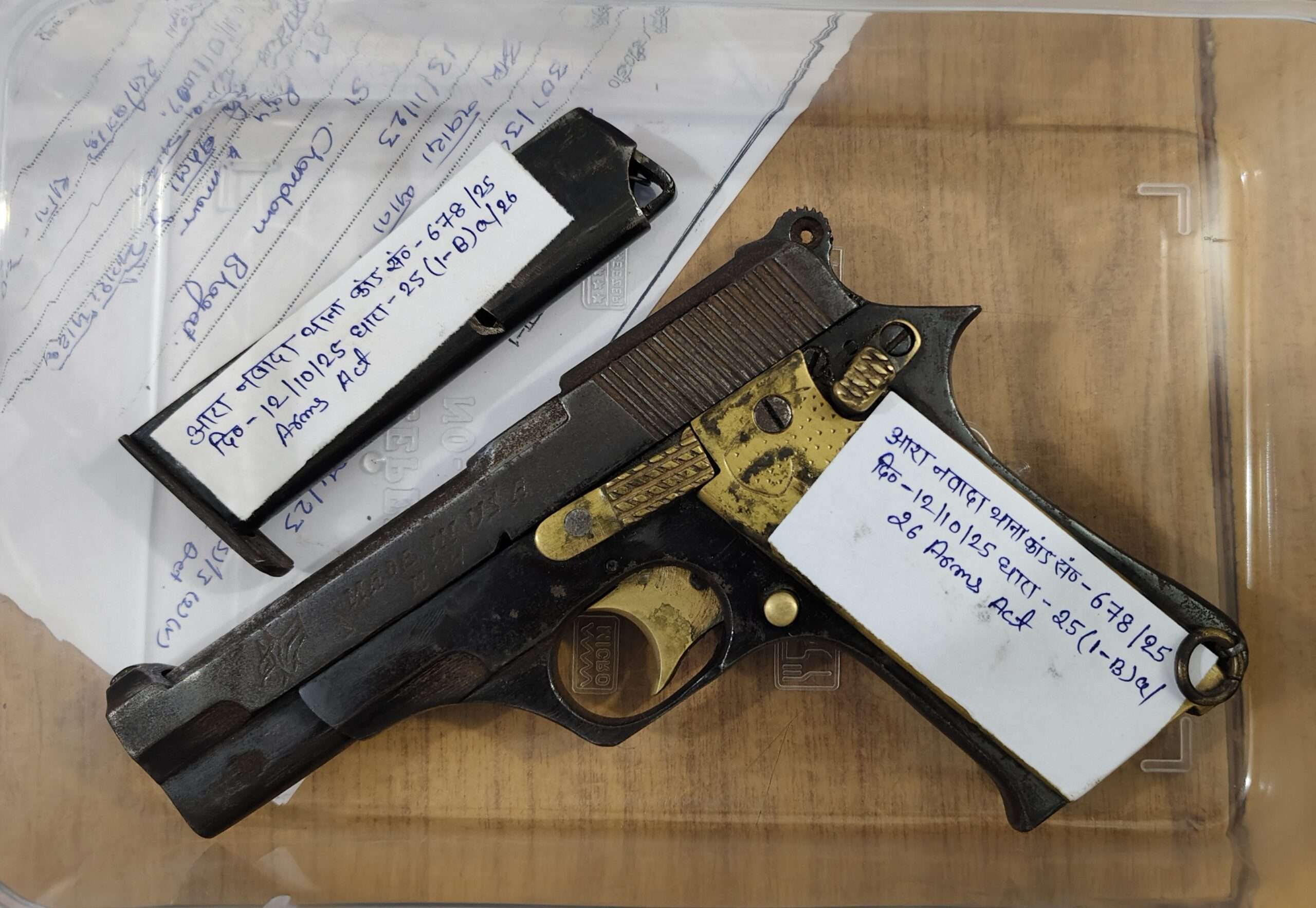 नवादा थाना क्षेत्र के जगदेव नगर गली नंबर छह में आर्म्स एक्ट के एक अभियुक्त की तलाश में पहुंची पुलिस को मैगजीन लोड एक देसी पिस्टल हाथ लग गया. पिस्टल की बरामदगी जगदेव नगर गली नंबर छह निवासी यश राज के घर से की गयी. संजय सिंह का पुत्र यश राज पूर्व के आर्म्स एक्ट कांड के अभियुक्त दीपू कुमार का दोस्त है. पुलिस दीपू कुमार की तलाश में शनिवार की रात गुप्त सूचना के आधार पर यश राज के घर छापेमारी करने पहुंची थी, लेकिन दीपू कुमार पकड़ में नहीं आ सका. यश राज भी भागने में सफल रहा. इस मामले दारोगा रौशन कुमार के बयान पर यश राज के खिलाफ आर्म्स एक्ट के तहत प्राथमिकी दर्ज की गयी है. एसपी राज की ओर से रविवार को प्रेस बयान जारी कर पिस्टल की बरामदगी की जानकारी दी गयी. पुलिस के अनुसार गुरुवार की रात जगदेव नगर गली नंबर सात निवासी दीपू कुमार के घर के कैंपस स्थित खटाल के पास से अवैध हथियार बरामद किया गया था. हालांकि दीपू कुमार भाग निकला था. शनिवार की रात सूचना मिली कि दीपू कुमार अपने दोस्त जगदेव नगर गली नंबर छह बी निवासी यश राज के घर छुपा हुआ है. उस आधार पर दारोगा रौशन कुमार के नेतृत्व में पुलिस टीम द्वारा यश राज के घर छापेमारी की गयी. तब यश राज तो भागने में सफल रहा, लेकिन उसके कमरे में बेड के नीचे से मैगजीन लोड एक देशी पिस्टल बरामद की गयी. छापेमारी में एएसआई पम्मी कुमारी सहित अन्य पुलिस कर्मी शामिल थे.डिस्क्लेमर: यह प्रभात खबर समाचार पत्र की ऑटोमेटेड न्यूज फीड है. इसे प्रभात खबर डॉट कॉम की टीम ने संपादित नहीं किया है