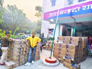 नवादा थाना पुलिस ने सोमवार को शहर के प्राइवेट बस स्टैंड के पास से अंग्रेजी शराब से लदे ट्रक को पकड़ा है. पुलिस ने मौके से ट्रक के चालक और खलासी को गिरफ्तार किया है. गिरफ्तार आरोपित मध्य प्रदेश के उज्जैन जिले के पवासा थाना क्षेत्र के शंकरपुर गांव निवासी रघुनाथ दाइमा का पुत्र सह ट्रक चालक प्रकाश दाइमा एवं उसी राज्य के शाजापुर जिले के कानड़ थाना क्षेत्र के दूधपुरा गांव निवासी हीरालाल बंजारा का पुत्र सह ट्रक खलासी पप्पू बंजारा है. बताया जाता है कि नवादा थाना पुलिस को गुप्त सूचना प्राप्त हुई की एमपी नंबर एक ट्रक से भारी मात्रा में अंग्रेजी शराब की खेप नवादा थाना क्षेत्र से गुजरनेवाली है. सूचना के उपरांत नवादा थाना के पीएसआइ अविनाश कुमार, एएसआइ ओम प्रकाश एवं सशस्त्र पुलिस बल ने पीछा कर नवादा थाना क्षेत्र के प्राइवेट बस स्टैंड के पास से अंग्रेजी शराब से लदे ट्रक को पकड़ा व ट्रक चालक व खलासी को भी गिरफ्तार किया है. जब्त ट्रक पर 750 एमएल का 121 कार्टन, 375 एमएल का 240 कार्टन एवं 180 एमएल के 87 कार्टन कुल 4135.68 लीटर शराब पकड़ी गयी है. यह उपलब्धि नवादा थाना पुलिस को मद्य निषेध पटना इकाई के संयुक्त छापेमारी से मिली है. वहीं शराब तस्करों द्वारा ट्रक में ही एक अलग से लोहे का बॉक्स बनाया गया था, जिसमें शराब के कार्टन को रखा गया. उसके चारों ओर प्लास्टिक के पाइप को रख दिया गया था, ताकि किसी को कुछ पता नहीं चल पाये.डिस्क्लेमर: यह प्रभात खबर समाचार पत्र की ऑटोमेटेड न्यूज फीड है. इसे प्रभात खबर डॉट कॉम की टीम ने संपादित नहीं किया है