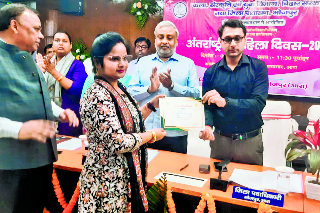 कला, संस्कृति एवं युवा विभाग तथा जिला प्रशासन के संयुक्त तत्वावधान में अंतरराष्ट्रीय महिला दिवस का भव्य आयोजन समाहरणालय सभागार में किया गया. कार्यक्रम की शुरुआत जिलाधिकारी तनय सुल्तानिया, नगर आयुक्त अंजुु कुमारी, अपर समाहर्ता, लोक शिकायत, अनुमंडल पदाधिकारी, आरा सदर द्वारा दीप प्रज्वलित कर की गयी. इस विशेष अवसर पर भोजपुर जिले के विभिन्न क्षेत्रों में उत्कृष्ट कार्य कर रही महिलाओं को सम्मानित किया गया. जिलाधिकारी द्वारा इन महिलाओं को प्रशस्ति पत्र एवं मोमेंटो भेंट कर उनकी उपलब्धियों की सराहना की गयी. कार्यक्रम में स्थानीय विद्यालयों के छात्र-छात्राओं द्वारा स्वागत गान प्रस्तुत किया गया. वहीं कावेरी मोहन ने दहेज गीती एवं जागो बहनों जागो बहनों की प्रस्तुति देकर महिलाओं को जागरूकता का संदेश दिया. इसके अलावा नारी कविताक्षतार काटो तरकुल काटो जैसे प्रेरणादायक गीतों ने समां बांध दिया. इस आयोजन में विभिन्न क्षेत्रों में उत्कृष्ट योगदान देने वाली महिलाओं को सम्मानित किया गया़ शिक्षा, स्वास्थ्य, कृषि, उद्योग, खेल, जीविका, स्वच्छता और नेतृत्व जैसे क्षेत्रों में बेहतर कार्य करने वाली महिलाओं को प्रशस्ति पत्र एवं मोमेंटो देकर प्रोत्साहित किया गया. इस अवसर पर पुष्पांजलि शर्मा प्रखंड समन्वय, शिवानी जायसवाल, कार्यपालक सहायके, रंजू कुमारी, स्वच्छता पर्यवेक्षक और शीला देवी, स्वच्छताकर्मी को उनके उत्कृष्ट कार्यों के लिए नगर आयुक्त, अनुमंडल पदाधिकारी सदर आरा अपर समाहर्ता, जिला पंचायती राज पदाधिकारी, जिला आपूर्ति पदाधिकारी, जिला कार्यक्रम पदाधिकारी, सूचना एवं जनसंपर्क पदाधिकारी सहित कई अन्य अधिकारी एवं कर्मी उपस्थित थे.डिस्क्लेमर: यह प्रभात खबर समाचार पत्र की ऑटोमेटेड न्यूज फीड है. इसे प्रभात खबर डॉट कॉम की टीम ने संपादित नहीं किया है