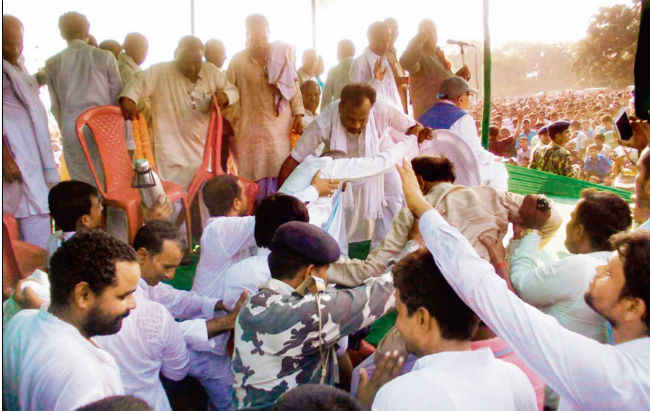 लालू प्रसाद के भाषण देने के दौरान ही मंच का उत्तरी किनारा टूट गया, जिससे थोड़ी देर के लिए अफरातफरी का माहौल बन गया. हालांकि मंच टूटने से किसी नेता व कार्यकर्ताओं को चोट नहीं पहुंची है. बताया गया कि मंच पर क्षमता से अधिक नेता व कार्यकर्ताओं के चढ़ जाने से ऐसी स्थिति बनी. छोटे मंच पर करीब सौ से अधिक कायकर्ता मौजूद थे.