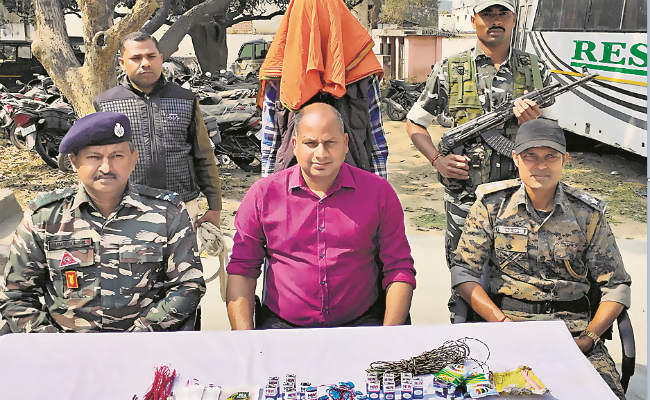 एएसपी अभियान राजेश कुमार सिंह ने बताया कि गिरफ्तार नक्सली बाइक से नक्सली संगठन के पास बम बनाने वाला सामान पहुंचाने जा रहा था. जब उसे रोककर तलाशी ली गयी तो उसके पास से नौ वोल्ट की 13 बैटरी, कनेक्टर स्विच, पांच सेलो टेप, 11 एलइडी बल्ब, पांच कलर फ्लेक्सिबल वायर, पांच इलेक्ट्रिक डेटोनेटर, एक मोबाइल बरामद हुआ. इसके अलावा एक बाइक बरामद हुई. 20 मीटर इलेक्ट्रिक वायर और नक्सली पर्चा भी उसके पास से मिला है. जो सामान बरामद हुआ उसे बम बनाने में इस्तेमाल किया जाता है.