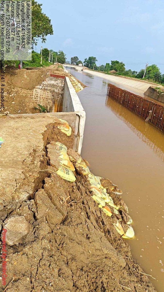 उत्तर कोयल मुख्य नहर में जल प्रवाह तेज होते के साथ हीं तटबंध टूटने की बढ़ी आशंका