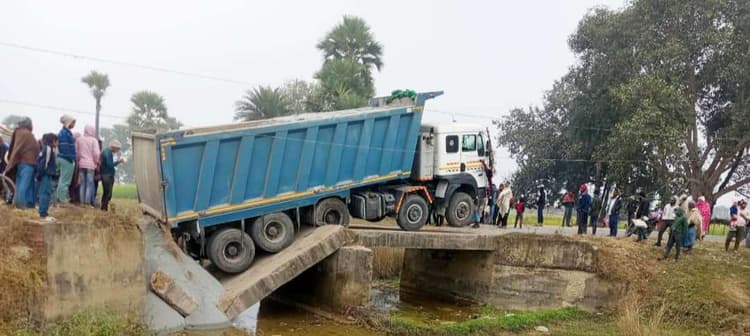 औरंगाबाद ग्रामीण. रफीगंज प्रखंड के बौर-बहादुरपुर गांव के समीप नाले पर 15 वर्ष पूर्व बनी पुलिया शुक्रवार की सुबह एक भारी वाहन के दबाव से अचानक ध्वस्त हो गयी. पुल पर हाइवा पार करने के दौरान यह हादसा हुआ. ओवरलोड हाइवा ध्वस्त पुल के बीच में फंस गयी, लेकिन गनीमत रही कि चालक किसी तरह कूदकर अपनी जान बचाने में कामयाब रहा. कुछ देर की जद्दोजहद के बाद हाइवा को पुल से सुरक्षित उतार लिया गया. इस दौरान उस पर लदा डस्ट गिरा दिया गया था. पुलिया ध्वस्त होने के बाद दर्जनों गांवों को जोड़ने वाले इस मार्ग पर हजारों लोगों के लिए आवागमन बाधित हो गया. घटना के बाद इलाके में अफरा-तफरी मच गयी. हाइवा के फंसने से सड़क पूरी तरह अवरुद्ध हो गई और दोनों ओर वाहनों की कतार लग गयी. सूचना मिलते ही बड़ी संख्या में स्थानीय ग्रामीण मौके पर जुट गए. यह सड़क ओबरा बाजार को सीधे रफीगंज बाजार से जोड़ती है और इस मार्ग से प्रतिदिन सैकड़ों लोग, स्कूल जाने वाले छात्र, मरीज, व्यापारी और किसान आवागमन करते हैं. पुलिया टूटने के कारण लोगों को अब कई किलोमीटर लंबा वैकल्पिक रास्ता अपनाने को मजबूर होना पड़ रहा है, जिससे समय और खर्च दोनों बढ़ गये हैं.