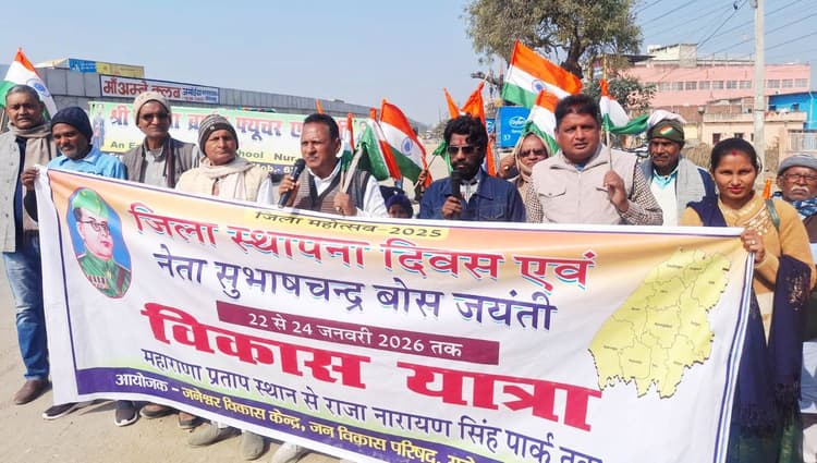 .जनेश्वर विकास केंद्र, जन विकास परिषद और महोत्सव परिवार के तत्वावधान में जिला स्थापना दिवस का आगाज गुरुवार से हुआ. जिला महोत्सव की शुरुआत विकास यात्रा से हुई. यह यात्रा महाराणा प्रताप प्रतिमा स्थल से शुरू होकर राजा नारायण सिंह पार्क तक गयी. इसमें आम लोगों के साथ-साथ सभी बुद्धिजीवी वर्ग व स्कूली बच्चों की भागीदारी रही. औरंगाबाद का सर्वांगीण विकास हो, नेताजी सुभाषचंद्र बोस अमर रहे के नारे लगे. शहर के सभी महापुरुषों की प्रतिमा पर माल्यार्पण कर लोगों ने उनकी कृतियों को स्मरण किया. रामानंद बीएड कॉलेज के निदेशक शंभूनाथ पांडेय ने महाराणा प्रताप की प्रतिमा पर पुष्पांजलि अर्पित करते हुए विकास यात्रा को रवाना किया. कार्यक्रम का नेतृत्व सिद्धेश्वर विद्यार्थी ने किया. उन्हें बताया कि हम लोगों की ओर से जिले के स्थापना वर्ष से ही जिले का स्थापना दिवस मनाया जा रहा है. हम जिले के संपूर्ण विकास की मांग उठाते रहे हैं. आज भी औरंगाबाद कई मूल विकास से वंचित है. मेडिकल कॉलेज , कृषि कॉलेज, रेलवे लाइन परियोजना, कोयल नहर परियोजना, हवाई अड्डा जैसी सुविधाओं से अभी भी जिला वंचित है. जबकि औरंगाबाद जिले से दस साल बाद भभुआ जिले का निर्माण हुआ और विकास के क्षेत्र में औरंगाबाद से वह तेज गति से आगे बढ़ा.औरंगाबाद को कमिश्नरी बनाने की मांग