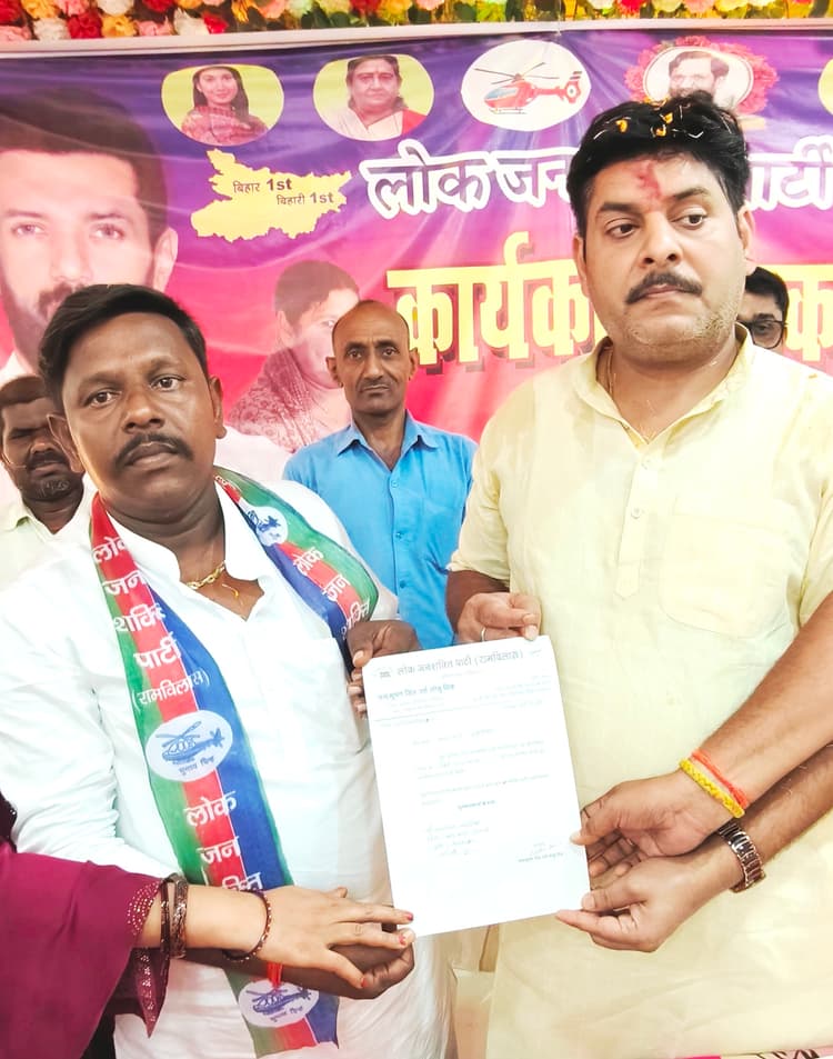 9ए-जिला उपाध्यक्ष अरुणजय पासवान को मनोनयन पत्र देते जिलाध्यक्ष सोनू सिंहऔरंगाबाद कार्यालय. औरंगाबाद शहर के एक होटल में लोजपा (रामविलास) के तत्वावधान में कार्यकर्ता बैठक सह मिलन समारोह का आयोजन किया गया. कार्यक्रम में उपस्थित कार्यकर्ताओं ने संकल्प लिया कि वे औरंगाबाद लोजपा को हर घर तक पहुंचायेंगे और विधानसभा चुनाव में एनडीए को जिताने में अपनी अहम भूमिका निभायेंगे. बड़ी बात यह रही कि हर जाति व समाज से दर्जनों युवाओं ने लोजपा की सदस्यता ग्रहण की. कार्यकर्ताओं ने एहसास दिलाया कि लोजपा के साथ पूरी मजबुती से खड़े है. जिलाध्यक्ष ने कहा कि लोजपा (रामविलास) का मिशन बिहार फर्स्ट-बिहारी फर्स्ट गूंजयमान हो रहा है. हर घर तक इस मिशन को कार्यकर्ता पहुंचा रहे है. हर कार्यकर्ता चिराग बनकर काम करें, ताकि बिहार का भविष्य स्वर्णिम हो. बिहार की जनता चिराग पासवान को उम्मीद भरी नजरों से देख रही है. पार्टी का मिशन है कि बिहार की तरक्की के साथ-साथ बिहारियों की तरक्की हो. औरंगाबाद जिले में लोजपा की पहचान एक मजबुत और सशक्त संगठन के रूप में हो रही है. इसके पीछे कार्यकर्ताओं की तत्परता व ईमानदारी पूर्वक की गयी मेहनत है. कार्यकर्ताओं को आश्वस्त करते हुए कहा कि हर हाल में पार्टी उनके साथ खड़ी है. वे पार्टी को मजबूती प्रदान करें. मिलन समारोह में लोजपा के वरिष्ठ नेता सुरेश पासवान सहित अन्य नेताओं ने औरंगाबाद के छह विधानसभा सीट में तीन सीट लोजपा के लिए मांग उठायी. यही नहीं कार्यकर्ताओं ने जिलाध्यक्ष चंद्रभूषण सिंह सोनू को भी विधानसभा चुनाव लड़ाने की मांग की. कार्यकर्ताओं ने कहा कि वे पार्टी के राष्ट्रीय अध्यक्ष को इससे संबंधित ध्यान आकृष्ट करायेंगे. कार्यक्रम का संचालन युवा नेता अमित कुमार ने किया.अरुणजय पासवान बने उपाध्यक्ष