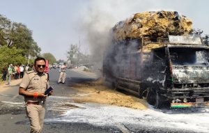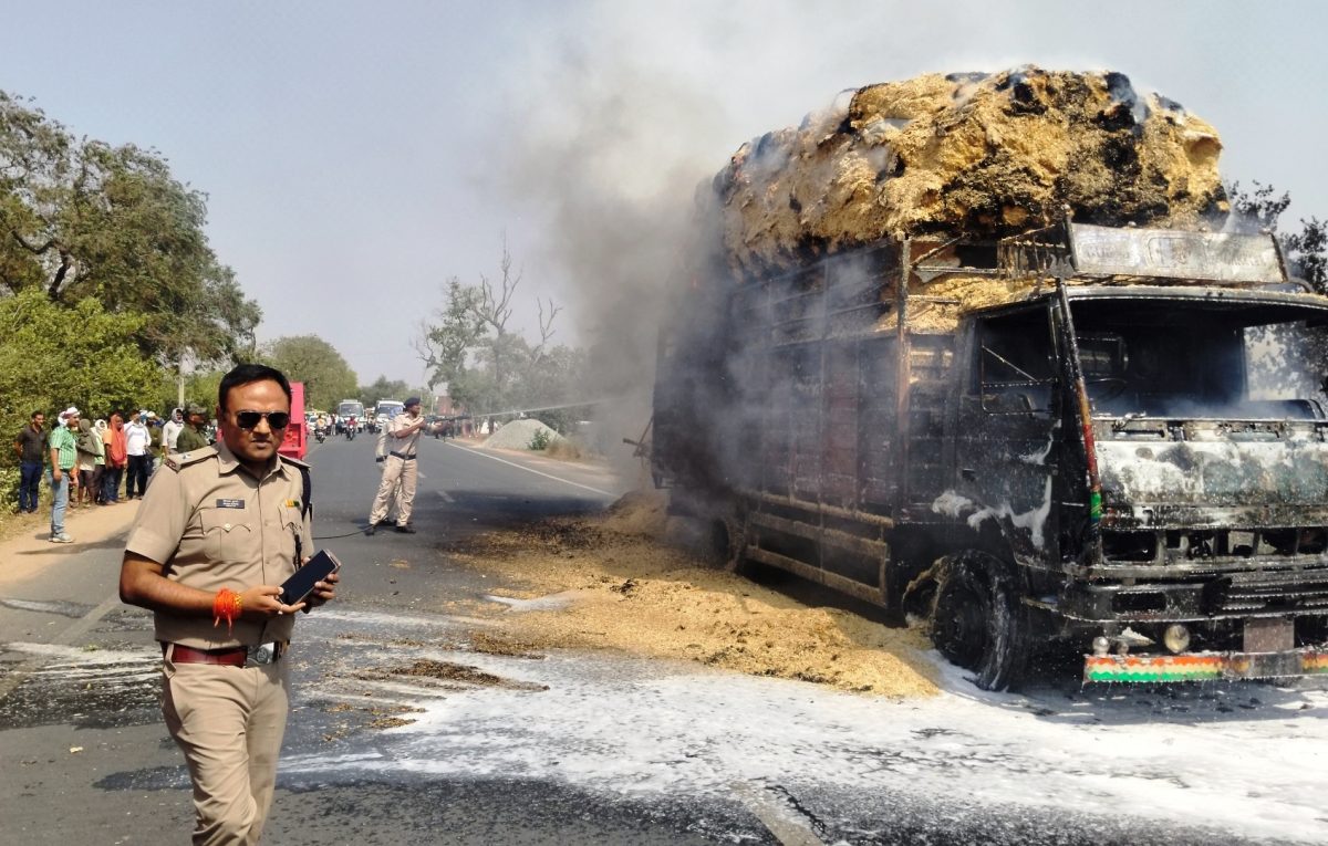 भूसा लदे ट्रक में लगी आग, दमकल से बुझी आग