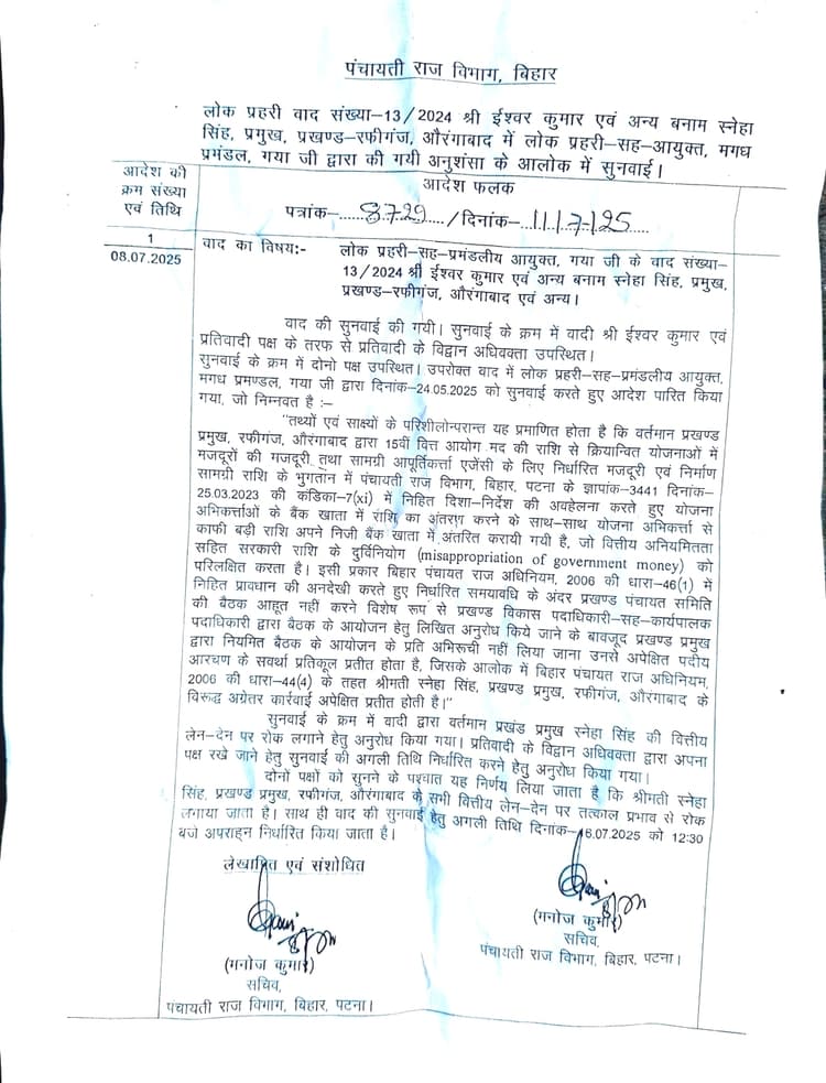 प्रखंड प्रमुख के सभी वित्तीय लेन-देन पर लगाया गया रोक रफीगंज. रफीगंज के प्रखंड प्रमुख स्नेहा सिंह पर वित्तीय अनियमितता का आरोप लगाये जाने का मामला प्रकाश में आया है. वैसे प्रखंड प्रमुख के सभी वित्तीय लेन-देन पर तत्काल प्रभाव से रोक लगा दी गयी है. मिली जानकारी के अनुसार, पंचायती राज विभाग में मामले की सुनवाई हुई. लोक प्रहरी वाद संख्या 13/2024 ईश्वर कुमार एवं अन्य बनाम स्नेहा सिंह के मामले में लोक प्रहरी सह आयुक्त मगध प्रमंडल गयाजी द्वारा की गयी अनुशंसा के आलोक में सुनवाई हुई. पत्रांक 8729 दिनांक 11 जुलाई 2025 को आदेश जारी किया गया. वाद की सुनवाई के क्रम के वादी ईश्वर कुमार एवं प्रतिवादी पक्ष के तरफ से अधिवक्ता उपस्थित रहे. वैसे सुनवाई के दौरान दोनों पक्ष उपस्थित थे. लोक प्रहरी सह प्रमंडलीय आयुक्त गयाजी द्वारा सुनवाई करते हुए आदेश पारित किया गया था. पंचायती राज विभाग के सचिव मनोज कुमार द्वारा आदेश फलक में कहा गया है कि सुनवाई के दौरान तथ्यों से प्रमाणित होता है कि प्रखंड प्रमुख द्वारा 15वीं वित्त आयोग मद की राशि से क्रियान्वित योजनाओं में मजदूरों की मजदूरी तथा सामग्री आपूर्तिकर्ता एजेंसी के लिए निर्धारित मजदूरी तथा निर्माण सामग्री राशि के भुगतान में पंचायती राज विभाग, बिहार, पटना के दिशा-निर्देश की अवहेलना करते हुए योजना अभिकर्ताओं के बैंक खाता में राशि का अंतरण करने के साथ-साथ योजना अभिकर्त्ता से काफी बड़ी राशि अपने निजी बैंक खाता में अंतरित करायी गयी है, जो वित्तीय अनियमितता सहित सरकारी राशि के दुर्विनियोग को परिलक्षित करता है. इसी प्रकार बिहार पंचायत राज अधिनियम, 2006 की धारा-46 (1) में निहित प्रावधान की अनदेखी करते हुए निर्धारित समयावधि के अंदर प्रखंड पंचायत समिति की बैठक आहूत नहीं करने विशेष रूप से प्रखंड विकास पदाधिकारी-सह-कार्यपालक पदाधिकारी द्वारा बैठक के आयोजन हेतु लिखित अनुरोध किये जाने के बावजूद प्रखंड प्रमुख द्वारा नियमित बैठक के आयोजन के प्रति अभिरुचि नहीं लिया जाना उनसे अपेक्षित पदीय आचरण के सवर्था प्रतिकूल प्रतीत होता है. इस आलोक में बिहार पंचायत राज अधिनियम 2006 की धारा-44(4) के तहत प्रखंड प्रमुख स्नेहा सिंह के विरुद्ध अग्रेतर कार्रवाई अपेक्षित प्रतीत होती है. सुनवाई के क्रम में वादी द्वारा वर्तमान प्रखंड प्रमुख स्नेहा सिंह की वित्तीय लेन-देन पर रोक लगाने हेतु अनुरोध किया गया. प्रतिवादी के अधिवक्ता द्वारा अपना पक्ष रखे जाने के लिए सुनवाई की अगली तिथि निर्धारित करने का अनुरोध किया गया है. दोनों पक्षों को सुनने के पश्चात यह निर्णय लिया गया कि स्नेहा सिंह के सभी वित्तीय लेन-देन पर तत्काल प्रभाव से रोक लगाया जाता है. साथ ही वाद की सुनवाई के लिए अगली तिथि 16 जुलाई को 12:30 बजे निर
