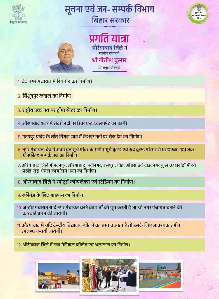 सीएम नीतीश ने औरंगाबाद जिले के देव नगर पंचायत में रिंग रोड का निर्माण की घोषणा की. इसके अलावा उन्होंने जिले में बिशुनपुर कैनाल का निर्माण, राष्ट्रीय उच्च पथ पर ट्रॉमा सेन्टर का निर्माण, औरंगाबाद शहर में अदरी नदी पर रिवर फ्रंट डेवलपमेंट का कार्य, मदनपुर प्रखंड के चाँद बिगहा ग्राम में केशहर नदी पर चेक डैम का निर्माण, नगर पंचायत, देव में अवस्थित सूर्य मंदिर के समीप सूर्य कुण्ड और रुद्र कुण्ड परिसर से एसएच-101 तक ग्रीनफील्ड सम्पर्क पथ का निर्माण, जिले के मदनपुर, औरंगाबाद, नवीनगर और दाउदनगर समेत कुल 7 प्रखंडों में नये प्रखंड-सह-अंचल कार्यालय भवन का निर्माण, औरंगाबाद जिले में स्पोर्ट्स कॉम्पलेक्स एवं स्टेडियम का निर्माण और नया मेडिकल कॉलेज एवं अस्पताल बनवाने की घोषणा की.