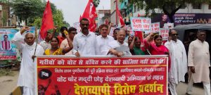 दाउदनगर. भाकपा माले के देशव्यापी आह्वान पर विशेष मतदाता पुनरीक्षण के खिलाफ दाउदनगर में विरोध प्रदर्शन निकाला गया. यह प्रदर्शन भखरूआं -पटना रोड स्थित भाकपा माले कार्यालय से निकल कर भखरुआं चौराहा से बाजार होते हुए नगर पर्षद कार्यालय के पास सभा में तब्दील हो गया. सभा की अध्क्षता प्रखंड सचिव चन्द्रमा पासवान व संचालन नगर सचिव बिरजू चौधरी ने किया. भाकपा माले के पोलित ब्यूरो सदस्य एवं काराकाट सांसद राजाराम सिंह ने कहा कि मतदाता पुनरीक्षण कार्य वोटरलिस्ट से गरीबों का नाम काटने की साजिश है. भाजपा ने चुनाव आयोग का सहारा लेकर दिल्ली सहित कई राज्यों में सत्ता काबिज किया है, ठीक उसी तरह भाजपा दिन में सपना देख रही है कि बिहार पर कब्जा कर लेंगे. जब सभी किसान-मजदूर खेती-किसानी में लगे हैं तथा बिहार के 35 प्रतिशत प्रवासी मजदूर प्रदेश में काम करने गये हैं, तो उनसे दस्तावेज मांगा जा रहा है. उन्होंने आरोप लगाते हुए कहा कि भाजपा चुनाव जीतने के लिए मतदाता सूची में हेराफेरी करती रही है और उल्टे चुनाव आयोग राहुल गांधी को डराने और रोकने की कोशिश में उन्हें शपथ पत्र पर हस्ताक्षर करने के लिए दबाव डाल रहा है. मतदाता सूची में एक लाख से ज्यादा फर्जी और संदिग्ध नामों का खुलासा कोई मामूली आपत्ति नहीं है, जिसे लोकल स्तर पर निपटा दिया जाये. ठीक उसी तरह का फर्जीवाड़ा कर बिहार की सत्ता पर भाजपा काबिज होना चाहती है. यह लोकतंत्र और संविधान पर सीधा हमला है. भाकपा माले मांग करता है कि विशेष मतदाता पुनरीक्षण कार्य चुनाव आयोग वापस ले. हम लोकतंत्र व संविधान की रक्षा के लिए हर कुर्बानी देने को तैयार हैं.भाजपा देश को हिटलरशाही और तानाशाही की ओर ले जाना चाहती है,जो देश को मंजुर नहीं है.हम सदन से सड़क तक लड़ाई लड़ रहे हैं और लड़ते रहेंगे. भाकपा माले जिला सचिव मुनारिक राम ने कहा कि सत्ता संरक्षित चुनाव आयोग द्वारा दलितों पिछड़ों अल्पसंख्यकों को नाम काटने की साजिश विशेष मतदाता पुनरीक्षण कार्य है. रोहतास जिला कमिटी सदस्य कैशर नेहाल, पूर्व जिला सचिव जनार्दन प्रसाद सिंह, राजद नगर अध्यक्ष मुन्ना अजीज ने भी संबोधित किया. मौके पर भाकपा माले टाउन सचिव बिरजु चौधरी, किसान महासभा के जिला सचिव कामता प्रसाद यादव, प्रखंड सांसद प्रतिनिधि राजकुमार भगत, काराकाट सांसद प्रतिनिधि पिंटू सिंह, नगर सांसद प्रतिनिधि कयूम अंसारी, सांसद के निजी सचिव नरेंद्र कुमार, आइसा नेता विकास कुमार, सत्येंद्रनारायण, पूर्व मुख्य पार्षद धर्मेंद्र कुमार, लक्ष्मण भुइंयां, नगर कतटी सदस्य सुदामा सिंह, महेंद्र राम, सुरेंद्र सिंह,जगदीश ठठेरा आदि उपस्थित थे.