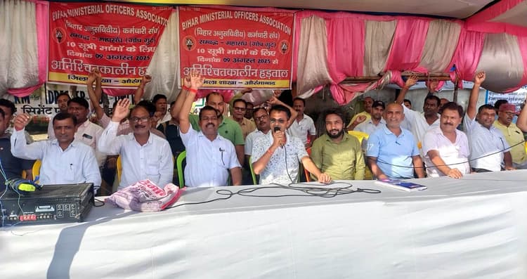 औरंगाबाद नगर. समाहरणालय लिपिकीय संवर्ग के कर्मी पिछले 11 दिनों से हड़ताल पर हैं. हड़ताल अवधि में बिहार अनुसचिवीय कर्मचारी संघ गोप गुट के बैनर तले जिले के लिपिकीय संवर्ग के कर्मी दानी बिगहा औरंगाबाद में धरने पर बैठे हैं. कर्मियों को हड़ताल पर रहने से सभी विभागों में कार्य ठप है. विभिन्न कार्यों को लेकर लोग कार्यालय का चक्कर लगा रहे हैं, परंतु कर्मचारियों को हड़ताल पर रहने से वापस लौटना पड़ रहा है. मंगलवार को भी दर्जनों की संख्या में समाहरणालय के लिपिक के संवर्ग के कर्मी धरने पर बैठे रहे. इसकी अध्यक्षता कर रहे संघ के अध्यक्ष भगवान पासवान ने कहा कि लिपिकीय संवर्ग के द्वारा 10 मांगों से कई बार सरकार को अवगत कराया गया है. बार-बार अवगत कराने के बाद भी सरकार हमारी मांगों पर ध्यान नहीं दे रही है. ऐसी स्थिति में बिहार अनुसूचिवीय कर्मचारी संघ गोप गुट द्वारा धरना प्रदर्शन किया जा रहा है. उन्होंने कहा कि सरकार के मंत्री एवं अधिकारी योगेंद्र गुट के लोगों से वार्ता कर कर्मचारियों को आपस में फूट डालकर हड़ताल समाप्त करवाने का प्रयास कर रहे हैं, परंतु उनकी यह नीति सफल नहीं होगी. हम सभी कर्मचारी पूरी तरह से एकजुट है. सचिव योगेंद्र कुमार ने बताया कि सरकार हमारी उचित मांगों पर पहल नहीं कर रही है. कर्मियों ने सरकार एवं योगेंद्र गुट के विरोध में नारेबाजी की. इस मौके पर कार्यकारी अध्यक्ष पिकेश कुमार, उपाध्यक्ष दिलीप कुमार सिंह, जितेंद्र कुमार, गुंजन राज, संयुक्त सचिव शशि कुमार सिंह, उपाध्याय कुमार मंगलम, प्रीतम कुमार, ज्ञानेंद्र कुमार, मुख्य संरक्षक न्याज अहसन अंसारी,कोषाध्यक्ष राहुल कुमार, कार्यालय सचिव सतीश कुमार, जिला संयोजक वीरेश पटेल, मीडिया प्रभारी मनीष कुमार, राजस्व शाखा के सहायक संजय कुमार, पंकज कुमार सिंह, दीपक कुमार, अरविंद कुमार अरुण, दिलीप कुमार आदि थे.