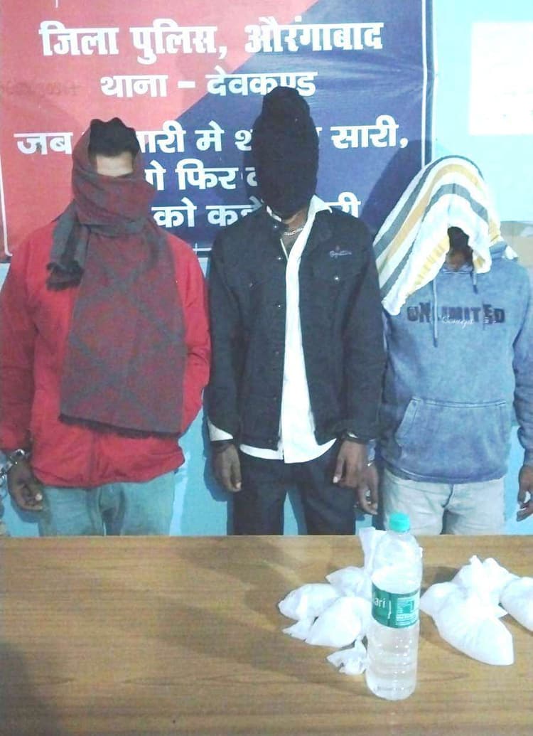 फोटो नंबर-9-देवकुंड पुलिस के गिरफ्त में धंधेबाज गोह. देवकुंड थाना पुलिस ने शनिवार की सुबह वाहन जांच के क्रम में शराब के साथ तीन युवकों को गिरफ्तार किया. पुलिस ने इनके पास से चार लीटर देसी शराब और दो बाइक जब्त की है. गिरफ्तार अभियुक्तों की पहचान देवकुंड निवासी लालबाबू राम के पुत्र गौतम कुमार, सूर्य दयाल पासवान के पुत्र मनीष कुमार व इसके साथ गोह थाना क्षेत्र के घेजना गांव के रामजी पासवान के पुत्र रणधीर कुमार के रूप में की गयी है. थानाध्यक्ष मनीष कुमार ने बताया कि वरीय पदाधिकारी के निर्देशानुसार देवकुंड के कुआं चौक के पास वाहन की जांच चल रही थी. इसी दौरान दोनों बाइक सवार युवक पुलिस को देखकर भागने लगे जिसपर शक हुआ. फिर दोनों बाइक चालकों को पकड़ लिया गया. थानाध्यक्ष ने बताया कि तीनों के खिलाफ बिहार मद्य निषेध एवं उत्पाद अधिनियम के तहत प्राथमिकी दर्ज कर आगे की कार्रवाई की जा रही है. वहीं जब्त शराब और बाइक को थाने लाया गया है.