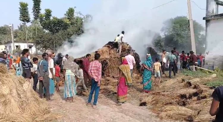 . शंभुगंज प्रखंड क्षेत्र के बेलारी गांव में धान के पुंज में आग लगने से करीब ढाई लाख का धान जलकर बर्बाद हो गया. शोर पर दौड़े ग्रामीणों के घंटों मशक्कत के बाद आग पर काबू पाया गया. इस दौरान फायर ब्रिगेड वाहन को भी बुलाया गया, लेकिन जब तक फायर ब्रिगेड वाहन घटनास्थल पर पहुंचे तबतक ग्रामीणों ने आग पर काबू पा लिया था. जानकारी के अनुसार बेलारी गांव में तीन किसानों ने खेती करने के लिए वटेया लगा दिया था. जहां सुभाष चंद्र झा के जमीन को श्याम मांझी, सिंटू झा की जमीन पर तेतर दास और सुधांशु झा उर्फ मोती झा की जमीन को रूपन यादव खेती कर रहे थे. इसी दौरान तीनों की कुल 10 बीघा से ज्यादा की धान काटकर तैयारी करने के पूर्व खलिहान पर लाकर रखा था. इसी दौरान शनिवार की सुबह में खलिहान पर रखे तीन किसानों के धान पुंज में अज्ञात तरीके से आग लग गयी और सभी धान जलकर राख हो गय. बताया जा रहा है कि तीनों किसानों के खेत आबाद कर रहे श्याम मांझी, तीतर दास और रूपन यादव ने घटना की जानकारी अंचल प्रशासन को दे दी है. पीड़ित श्याम मांझी, रूपन यादव और तेतर दास ने बताया की महाजन से कर्ज लेकर उन्होंने धान की खेती की थी, लेकिन आग ने उनके सारे मंसुबे पर पानी फेर दिया. वहीं अंचलाधिकारी जुगनू रानी ने बताया कि धान पुंज जलने की सूचना मिली हैं. हल्का कर्मचारी को जांच के लिये घटना स्थल पर भेज दिया गया हैं.डिस्क्लेमर: यह प्रभात खबर समाचार पत्र की ऑटोमेटेड न्यूज फीड है. इसे प्रभात खबर डॉट कॉम की टीम ने संपादित नहीं किया है