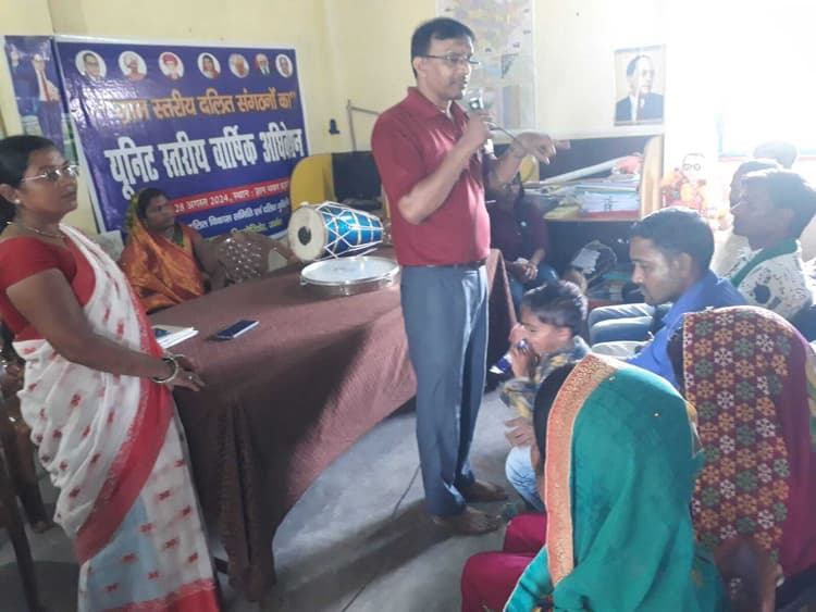 कटोरिया. आनंदपुर ओपी क्षेत्र के कड़वामारण गांव स्थित ज्ञान भवन परिसर में बुधवार को ग्राम स्तरीय दलित संगठनों का यूनिट स्तरीय अधिवेशन का आयोजन किया गया. अधिवेशन का विधिवत शुभारंभ बीडीवीएस के युवा राज्य समन्यक वीरेंद्र कुमार ने बाबा साहब डॉ भीमराव आंबेडकर के तैलचित्र पर माल्यार्पण व दीप प्रज्वलित कर किया. रीना देवी की अध्यक्षता में कार्यक्रम का सफल संचालन महिला उत्प्रेरक सुनीता देवी ने किया. इस अवसर पर विषय प्रवेश के दौरान संस्था प्रमुख महेंद्र कुमार रौशन ने बताया कि भारतीय संविधान व संविधान में निहित मौलिक एवं मानवाधिकार की रक्षा के साथ लोकतंत्र की रक्षा करना दलित संगठन का मूल उद्येश्य है. सुप्रीम कोर्ट द्वारा अनुसूचित जाति/जन जाति अत्याचार निवारण अधिनियम 1989 में बदलाव के मुद्दे पर 2 अप्रैल 2018 में दलित वर्ग सड़क पर आ गये थे, जिसमें 13 साथियों ने शहादत दी थी. ठीक उसी प्रकार आरक्षण में उप वर्गीकरण एवं क्रीमीलेयर के मुद्दे पर फिर से 21 अगस्त 2024 को भारत बंद किया गया, यह संगठन की शक्ति है. इस तरह गांव स्तर पर बहुत सारी मुद्दे हैं, जिसे चिह्नित कर संवैधानिक लड़ाई लड़ने की जरूरत है. इसलिए ग्राम स्तरीय दलित संगठन का निर्माण कर अधिवेशन का आयोजन किया गया है. उन्होंने बताया कि एक अक्टूबर से तीन अक्टूबर तक पटना में राज्य स्तरीय दलित संगठनों का अधिवेशन निर्धारित है. जिसमें बिहार प्रदेश के हर लक्ष्य समूह जिले से सैकड़ों की संख्या में लोग शामिल होने वाले हैं. इस अवसर पर मुख्य अतिथि वीरेंद्र कुमार ने बताया कि संविधान में निहित प्रावधानों को लोगों को जानने की जरूरत है, तभी हक-अधिकार मिलना संभव होगा. इस अवसर कार्यक्रम के प्रारंभ में भारतीय संविधान के प्रस्तावना को देवराज कुमार के द्वारा पढ़ा गया. वहीं रामू ताती, पिंकी देवी, दीपक कुमार, महालाल बेसरा, लखन मुर्मू, रूबी कुमारी, मुन्नी देवी, बंदना देवी, बादली देवी, तिखनी आदि अन्य लोगों ने झूमर एवं संगठन के गीत गाकर लोगों को मंत्रमुग्ध कर दिया.