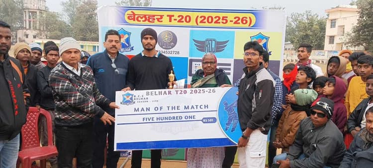 बेलहर. प्रखंड मुख्यालय स्थित शहीद झामा मैदान परिसर में रविवार को बीसीसी टी-20 क्रिकेट टूर्नामेंट के 11वां सीजन का तीसरा मुकाबला विराट 11 बहजोरा एवं मां दुर्गा स्पोर्टिंग क्लब बांका के बीच खेला गया. मैच का उद्घाटन बेलहर पंचायत के मुखिया प्रतिनिधि रामजी भगत एवं उपमुखिया सच्चिदानंद भगत के द्वारा खिलाडियों से परिचय लेकर एवं पहला बॉल एवं बैटिंग कर किया गया. वहीं अतिथि को कमेटी के अध्यक्ष लक्ष्मण कुमार एवं कोषाध्यक्ष पंकज भगत ने अंग वस्त्र देकर स्वागत किया. टॉस जीतकर बहजोरा की टीम ने पहले गेंदबाजी करने का फैसला लिया. पहले बैटिंग करते हुए बांका की टीम ने 20 ओवर में 6 विकेट खोकर 187 रन बनाया. जिसका पीछा करते हुए बहजोरा की टीम ने 19 ओवर एक बॉल पर आठ विकेट खोकर ही 191 रन बनाकर 2 विकेट से मैच जीत लिया. इस मुकाबले में मैन ऑफ द मैच बहजोरा के विष्णु पांडेय को शानदार सात छक्का एवं पांच चौका मारकर 60 रन बनाने पर चुना गया, जिसे अतिथियों के अलावे संरक्षक पूर्व कप्तान एवं कमेंटेटर संतोष भगत, रालोमो नेता शैलेंद्र कुमार मंटू, उमा दीदी आदि के द्वारा मेडल एंव 500 का चेक तथा हैट्रिक छक्का मारने पर एक हजार का नगद पुरस्कार देकर सम्मानित किया गया. वहीं मैच में अंपायर की भूमिका कंचन कुमार एवं शुभम कुमार ने अदा किया. वहीं कॉमेंट्री रवि प्रकाश ने किया.