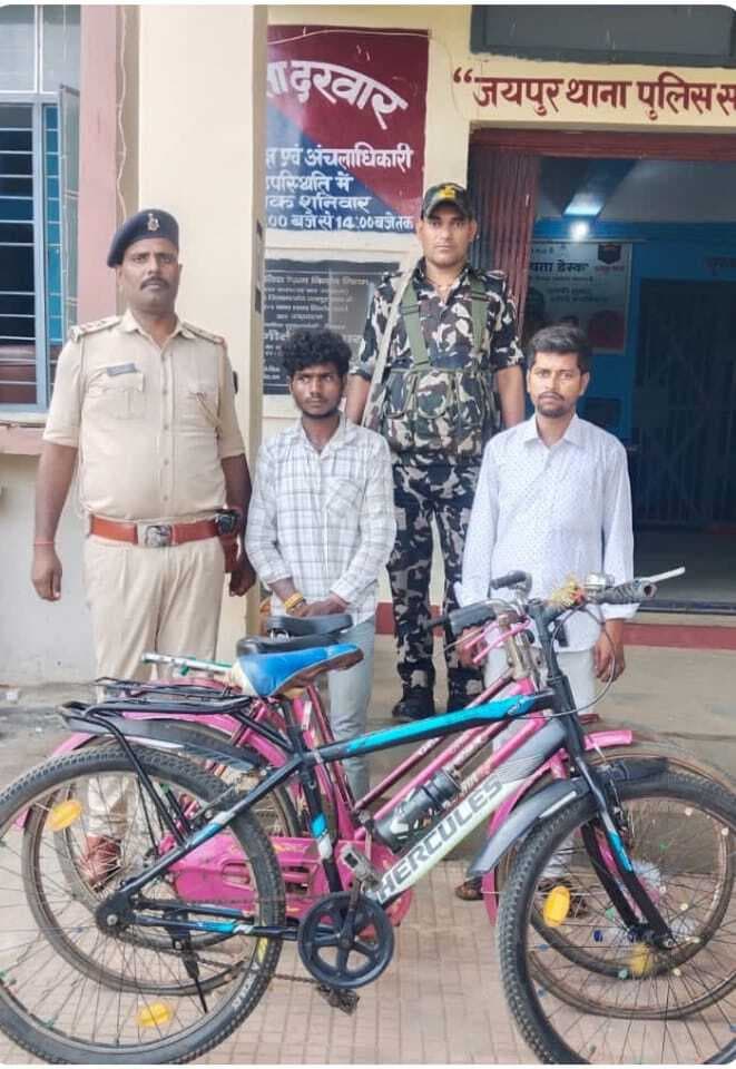 जयपुर. जयपुर थाना क्षेत्र अंतर्गत पिछले दिनों हटिया बाजार व मेले से कई साइकिलों की चोरी हुई थी. ग्रामीणों की शिकायत पर अनुसंधान के क्रम में जयपुर थाना अध्यक्ष आलोक कुमार ने साइकिल चोर गिरोह का उदभेदन कर लेने में सफलता हासिल की है. इस क्रम में चोरी की तीन साइकिल समेत दो आरोपियों को भी पुलिस ने गिरफ्तार किया है. जिसमें एक साइकिल चोर व एक चोरी की साइकिल खरीदने वाला खरीदार शामिल हैं. पुलिस सूत्रों के अनुसार गिरफ्तार साइकिल चोर का नाम गणेश तुरी पिता इतल तुरी ग्राम तीरनगर कुरेवा थाना मोहनपुर जिला देवघर बताया गया है. उसकी निशानदेही पर साइकिल खरीदने वाले युगल किशोर यादव पिता नरेश यादव गांव कुमरबांक थाना जयपुर को गिरफ्तार किया गया. उसके घर से चोरी की तीन साइकिल भी बरामद हुआ.